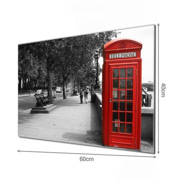 Material: 4mm Sicherheitsglas mit Metallrückwand Eigenschaften: beschreibbar, magnetisch, kratzfest Maße: 60x40x0,6cm, 3,6kg schwer Motiv Nummer 10077 London Red Telephone Zubehör: inklusive 4 Neodym-Magnete