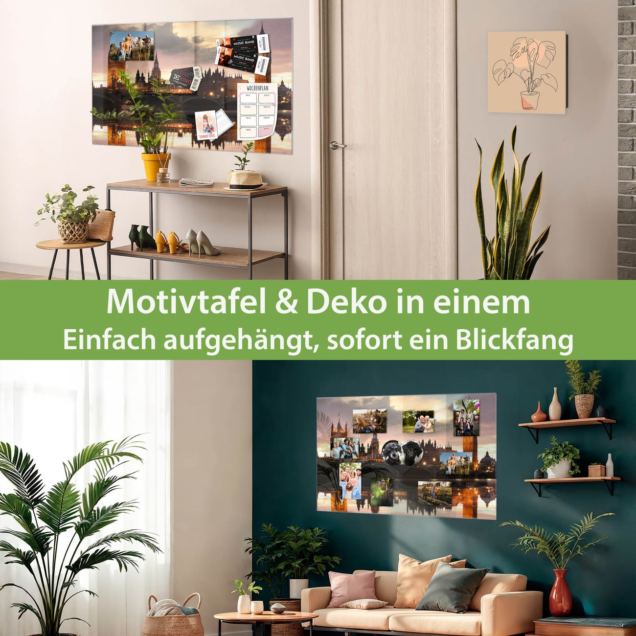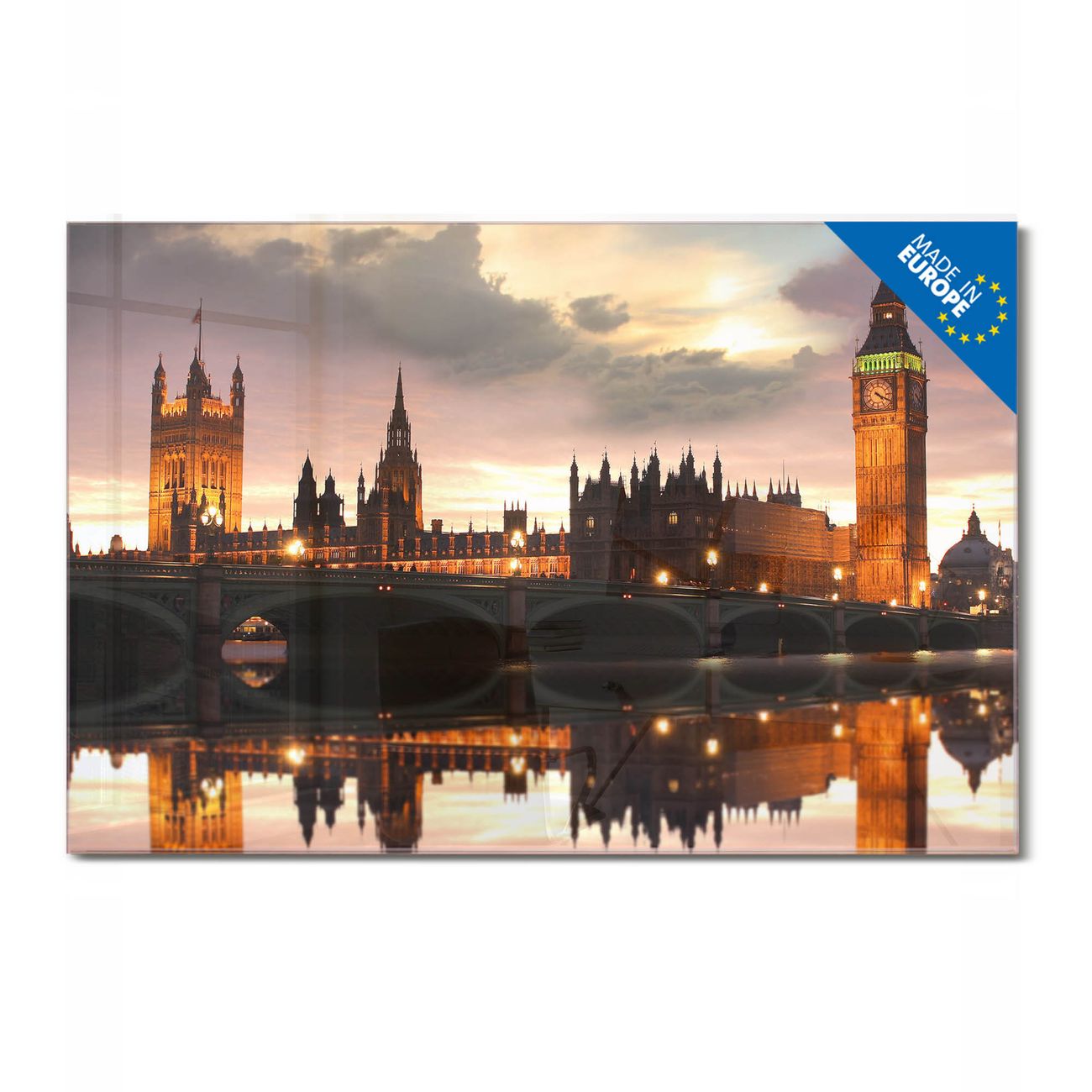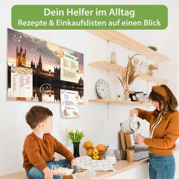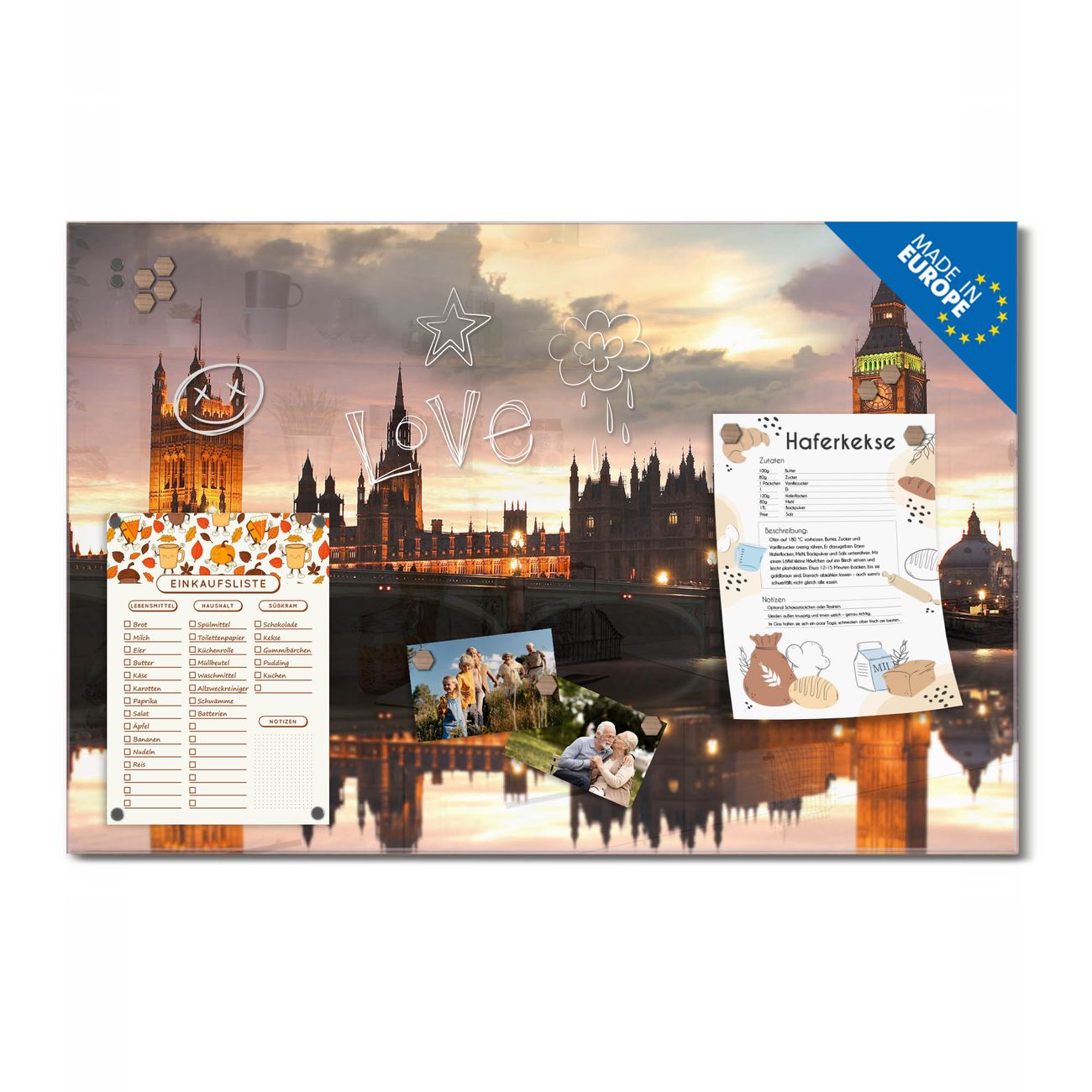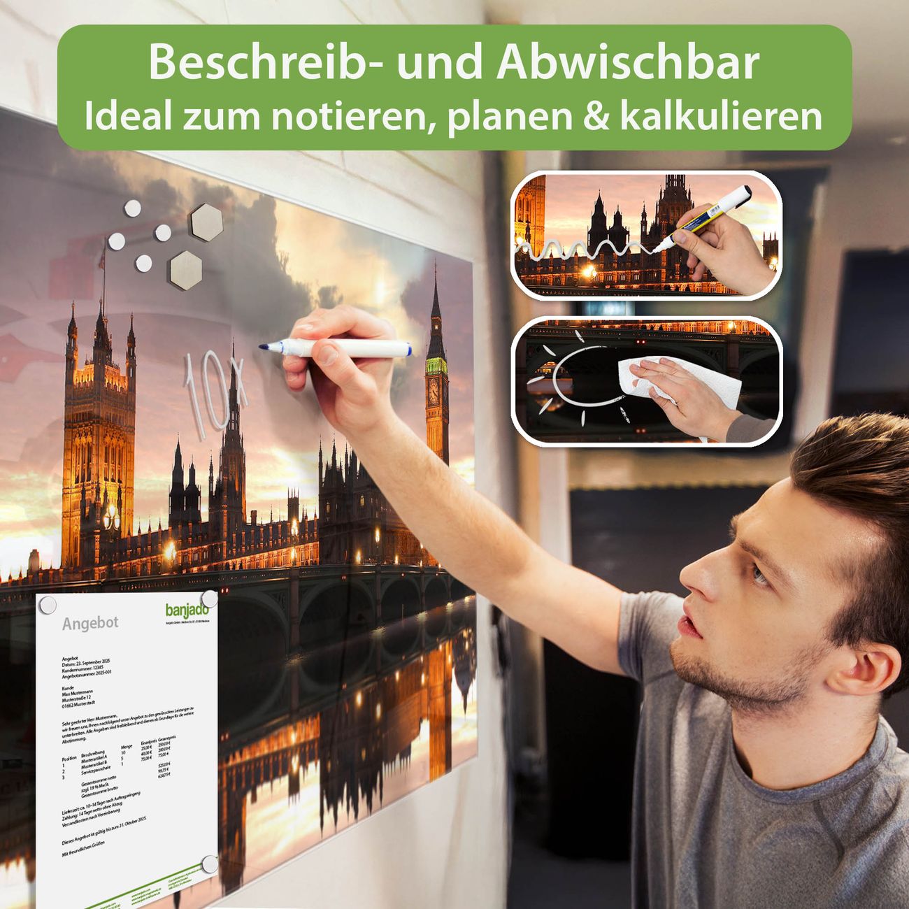 Material: 4mm Sicherheitsglas mit Metallrückwand Eigenschaften: beschreibbar, magnetisch, kratzfest Maße: 45x30x0,6cm, 2,03kg schwer Motiv Nummer 10205 Palace of Westminster Zubehör: inklusive 4 Neodym-Magnete