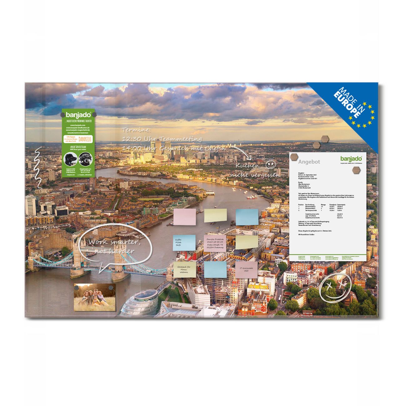 Material: 4mm Sicherheitsglas mit Metallrückwand Eigenschaften: beschreibbar, magnetisch, kratzfest Maße: 120x80x0,6cm, 14,40kg schwer Motiv Nummer 11115 London Zubehör: inklusive 4 Neodym-Magnete