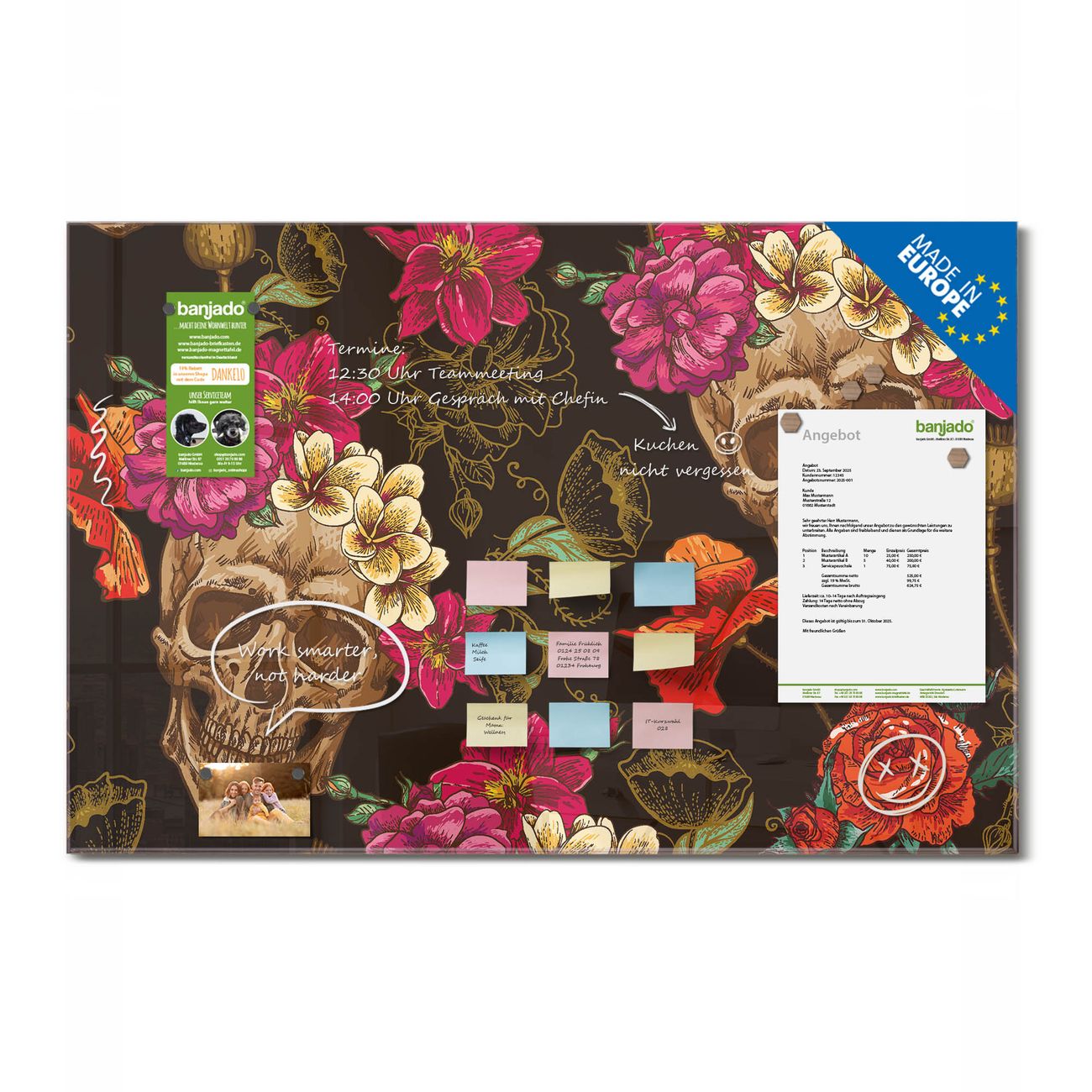 Material: 4mm Sicherheitsglas mit Metallrückwand Eigenschaften: beschreibbar, magnetisch, kratzfest Maße: 120x80x0,6cm, 14,40kg schwer Motiv Nummer 12509 Los Dias de Muertos Zubehör: inklusive 4 Neodym-Magnete