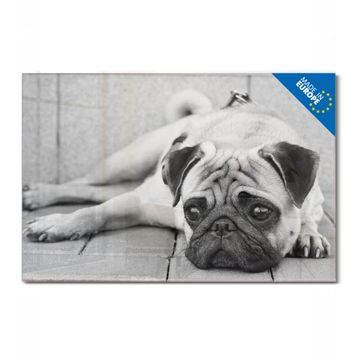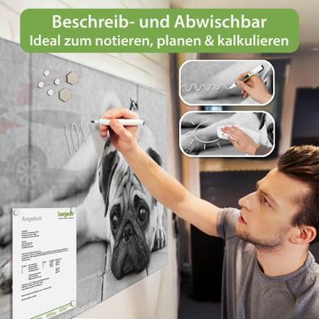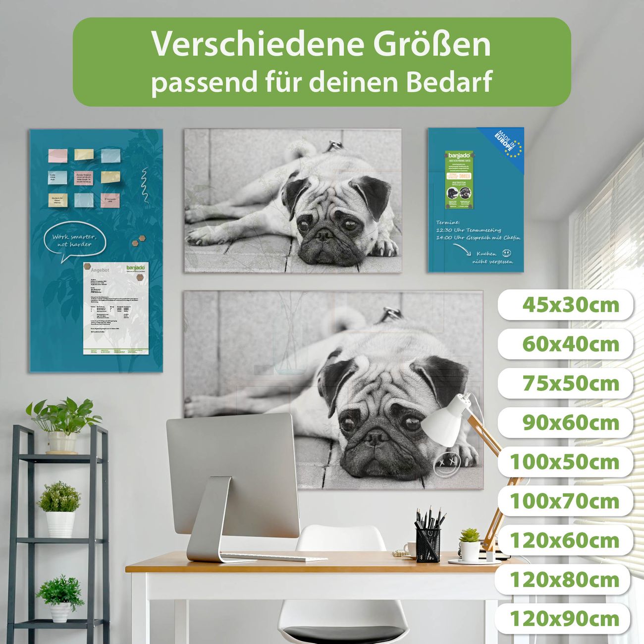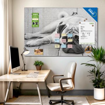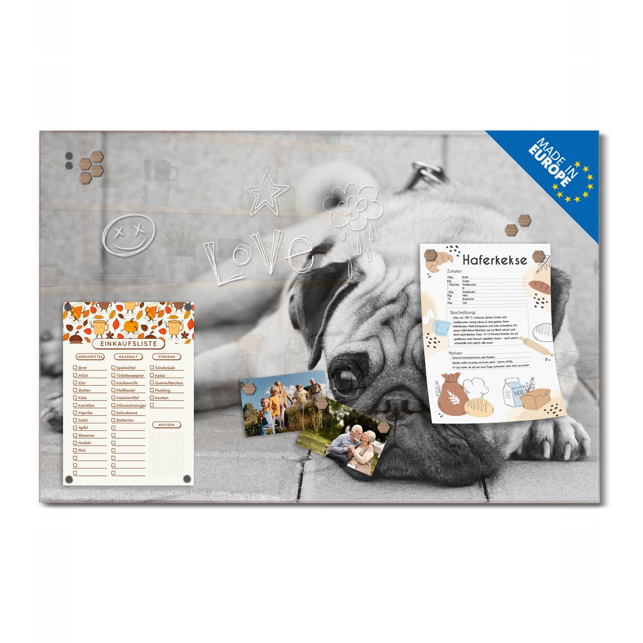 Material: 4mm Sicherheitsglas mit Metallrückwand Eigenschaften: beschreibbar, magnetisch, kratzfest Maße: 75x50x0,6cm, 5,63kg schwer Motiv Nummer 11474 Lotty Zubehör: inklusive 4 Neodym-Magnete