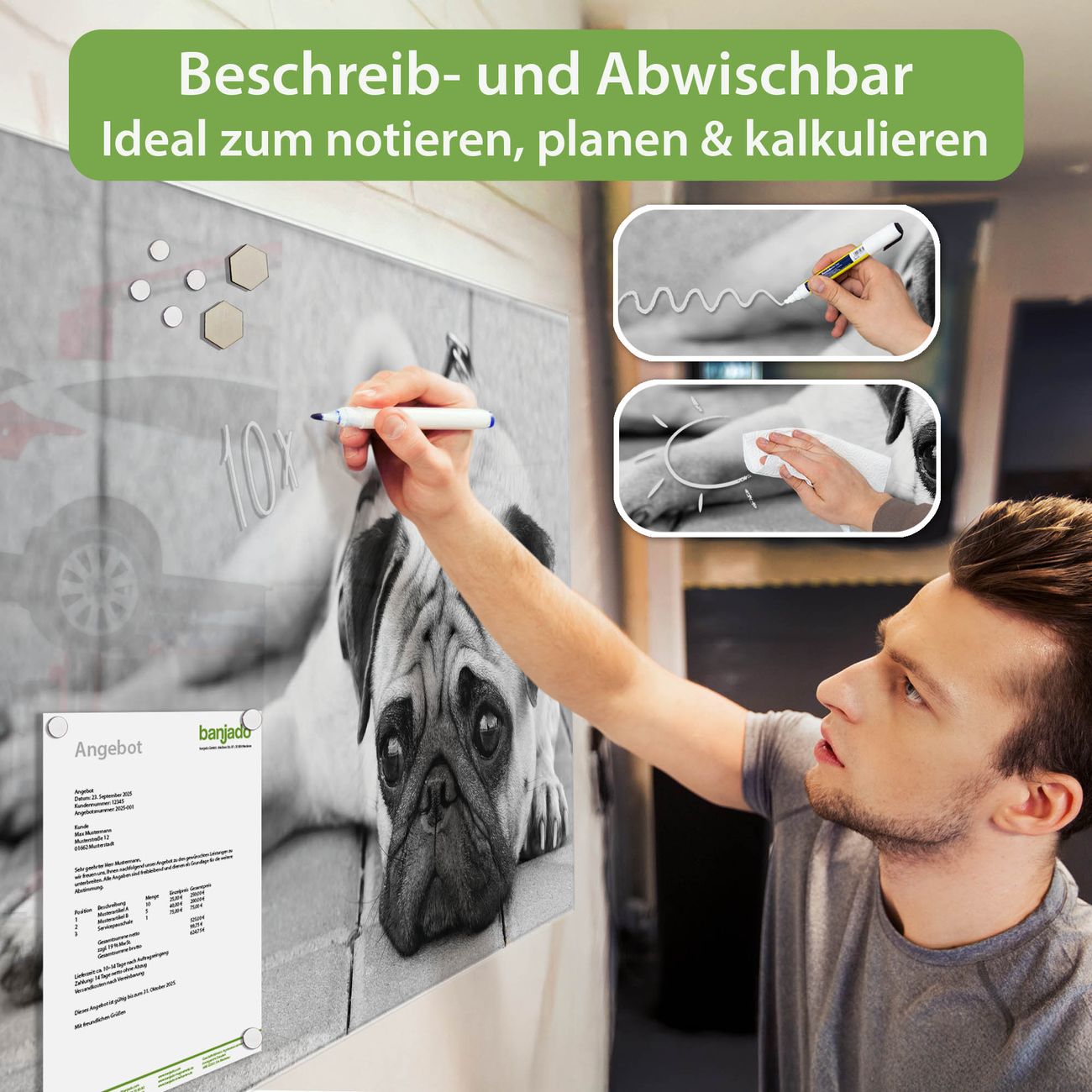Bitte beachten Sie, dass ausschliessliche spezielle Magnete an der Glastafel haften. Wir empfehlen banjado Neodym Magnete, diese sind durch uns auf Wirksamkeit geprüft.