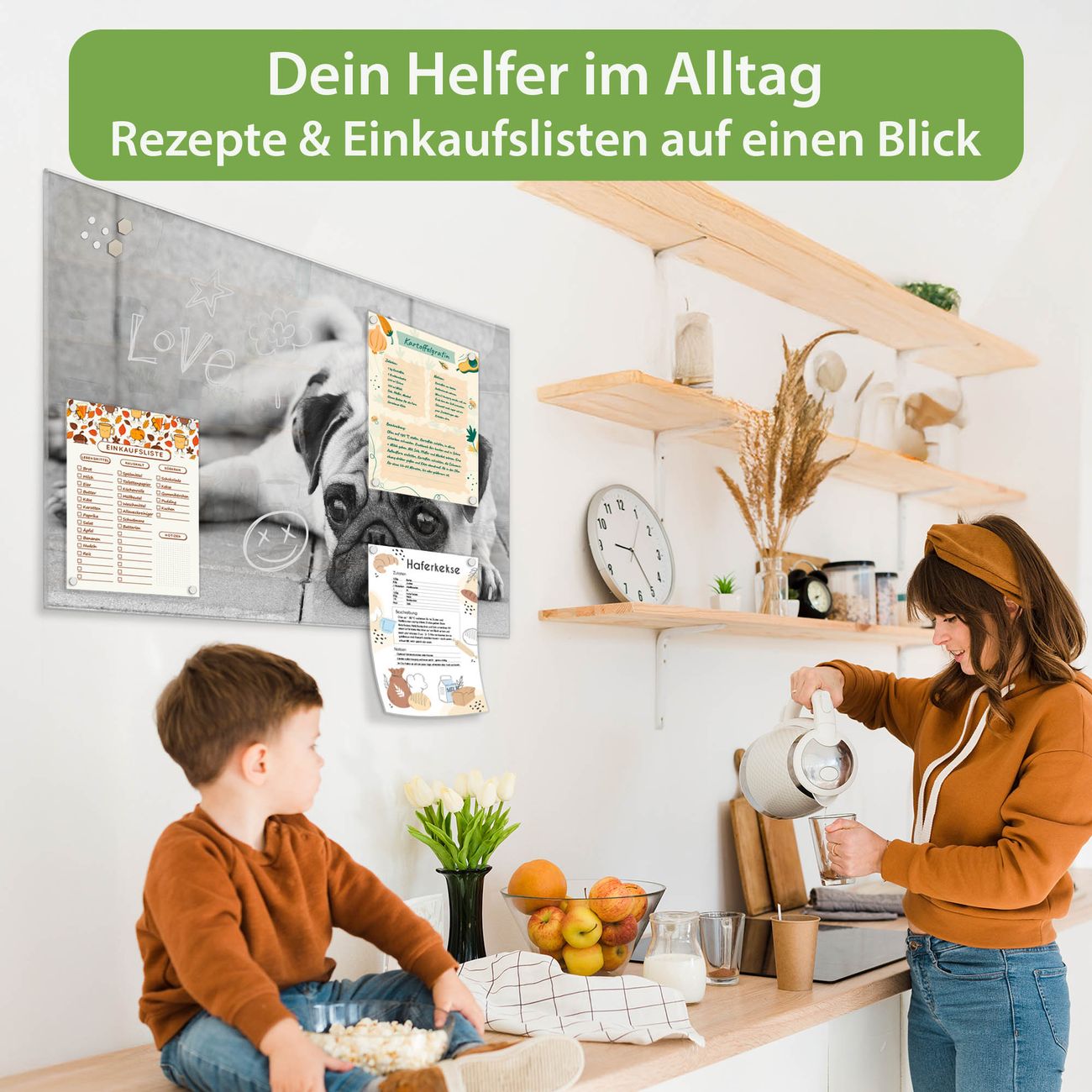 Auf der glatten Glasoberfläche lassen sich Termine, Rezepte oder Notizen ganz einfach mit Kreidestiften festhalten und rückstandslos entfernen. Starke Neodym-Magnete halten Ihre wichtigsten Erinnerungen sicher an Ort und Stelle. So entsteht Ihre ganz persönliche Ideenwand - jeden Tag neu.