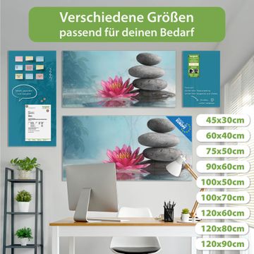 Material: 4mm Sicherheitsglas mit Metallrückwand Eigenschaften: beschreibbar, magnetisch, kratzfest Maße: 100x50x0,6cm, 7,50kg schwer Motiv Nummer 10818 Lotus Und Steine Zubehör: inklusive 4 Neodym-Magnete