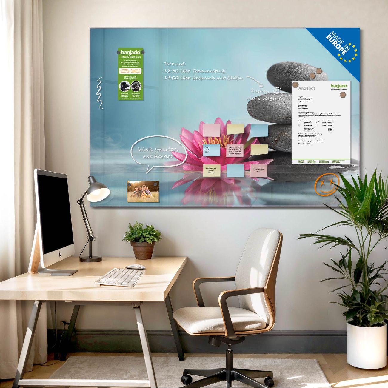 Jede Glas Magnettafel wird in unserer Werkstatt von Hand gefertigt und sorgfältig geprüft. So erhalten Sie ein echtes Qualitätsprodukt, das Funktion und Ästhetik perfekt vereint.?? Warum banjado?