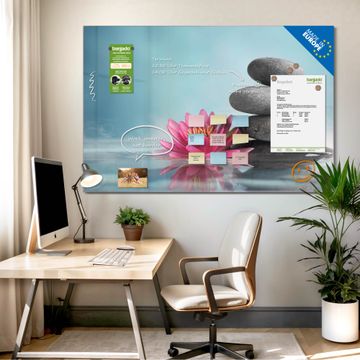 Material: 4mm Sicherheitsglas mit Metallrückwand Eigenschaften: beschreibbar, magnetisch, kratzfest Maße: 120x80x0,6cm, 14,40kg schwer Motiv Nummer 10818 Lotus Und Steine Zubehör: inklusive 4 Neodym-Magnete