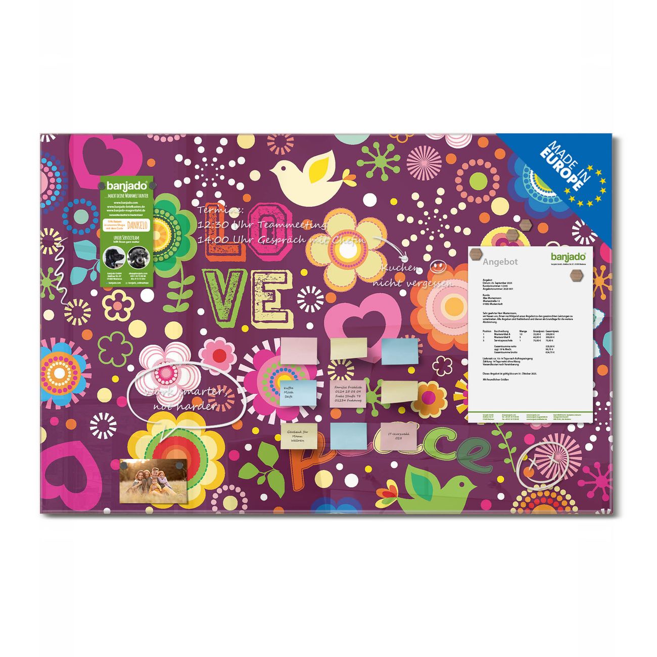 Material: 4mm Sicherheitsglas mit Metallrückwand Eigenschaften: beschreibbar, magnetisch, kratzfest Maße: 120x80x0,6cm, 14,40kg schwer Motiv Nummer 10037 Love and Peace Zubehör: inklusive 4 Neodym-Magnete