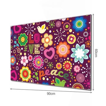 Material: 4mm Sicherheitsglas mit Metallrückwand Eigenschaften: beschreibbar, magnetisch, kratzfest Maße: 90x60x0,6cm, 8,10kg schwer Motiv Nummer 10037 Love and Peace Zubehör: inklusive 4 Neodym-Magnete