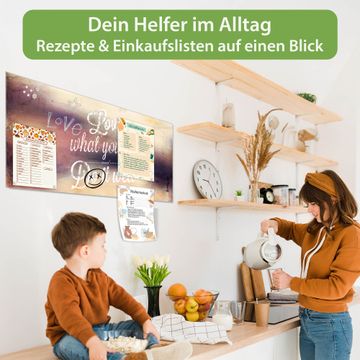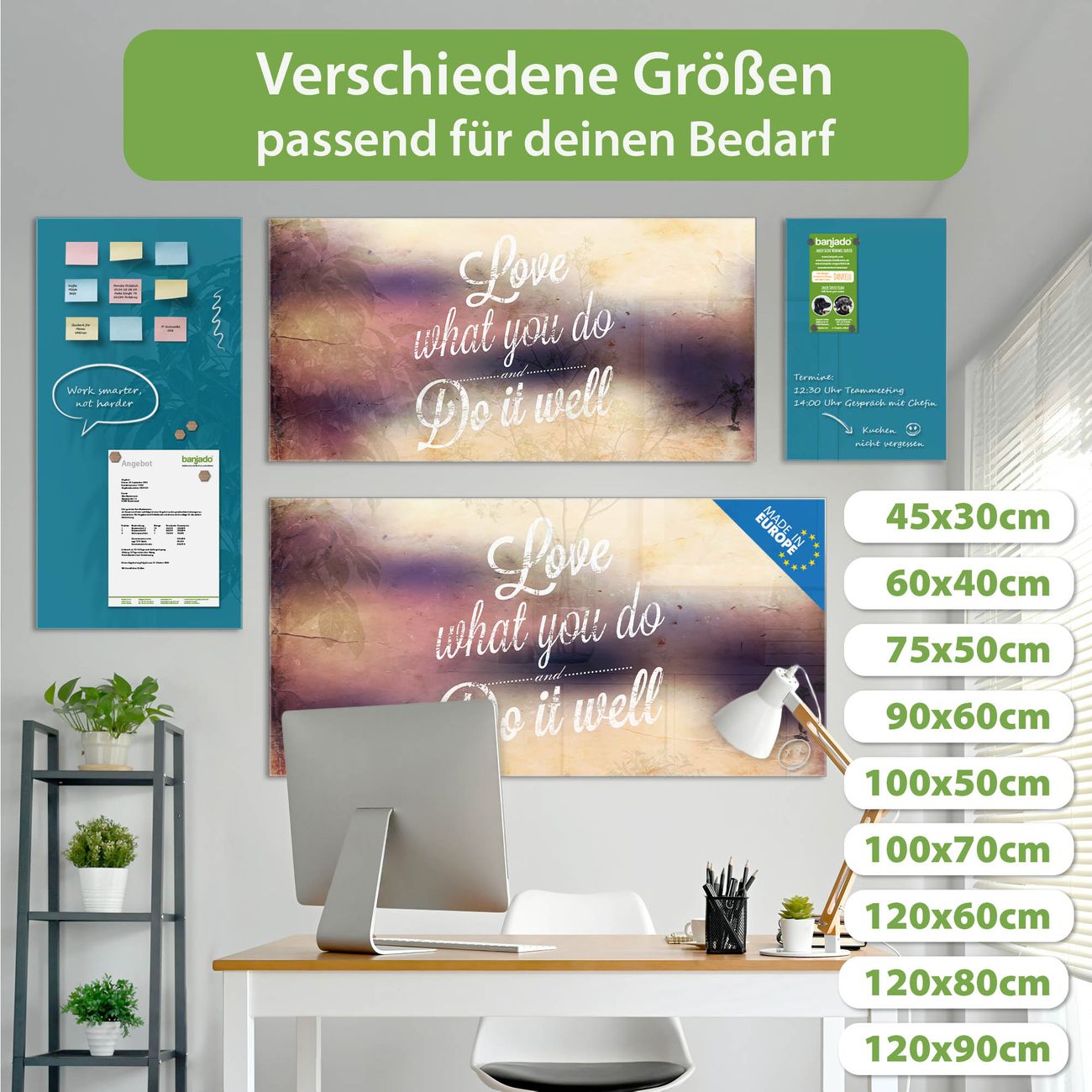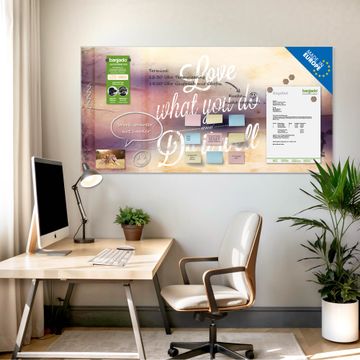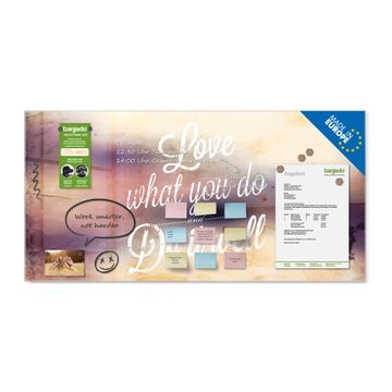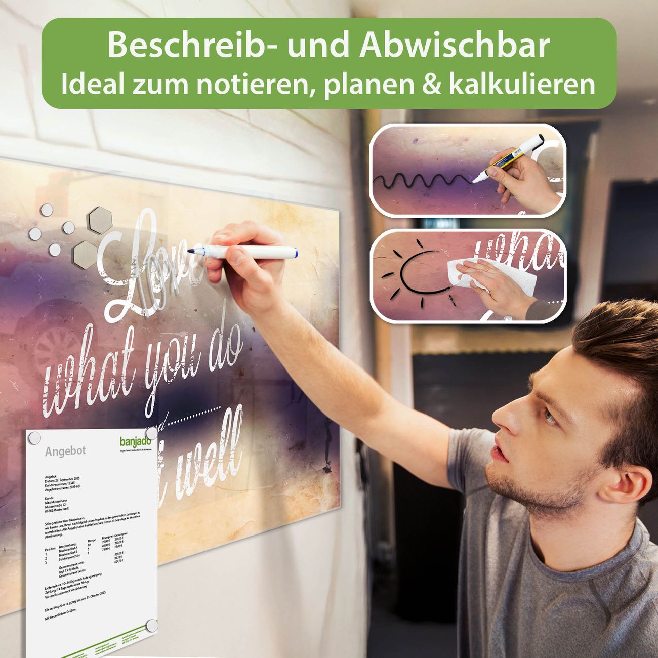 Material: 4mm Sicherheitsglas mit Metallrückwand Eigenschaften: beschreibbar, magnetisch, kratzfest Maße: 100x50x0,6cm, 7,50kg schwer Motiv Nummer 12771 Love What You Do Zubehör: inklusive 4 Neodym-Magnete