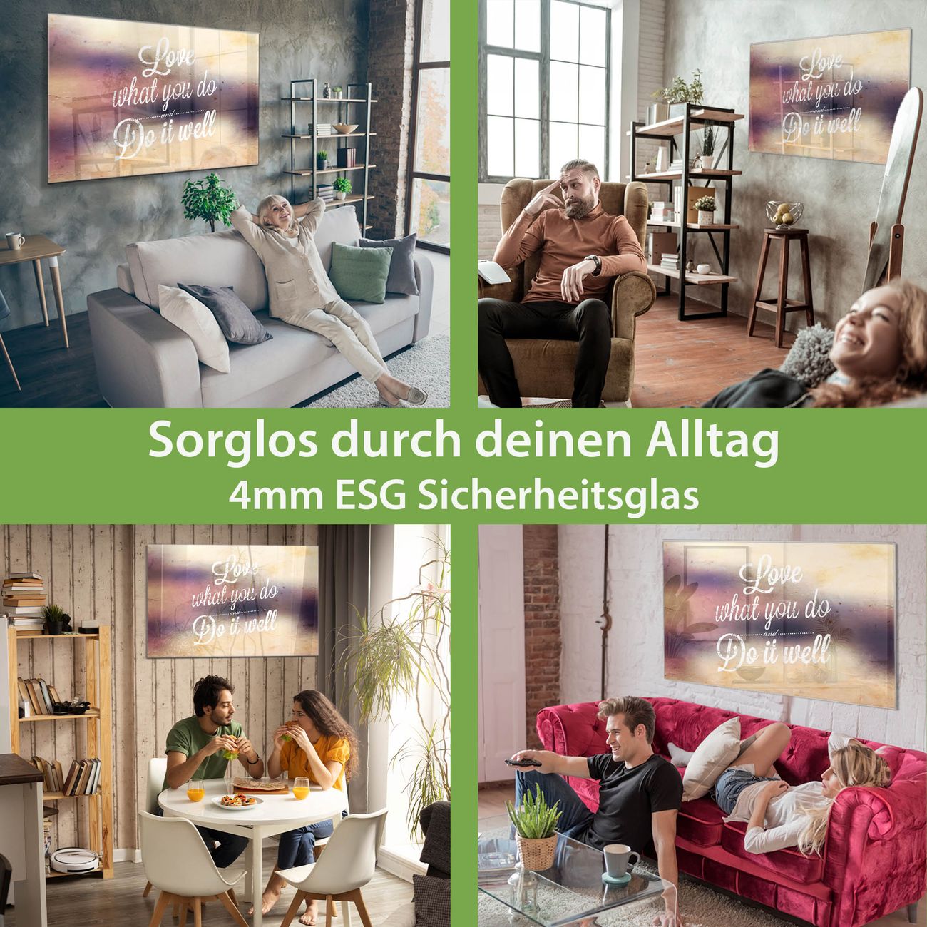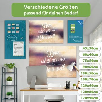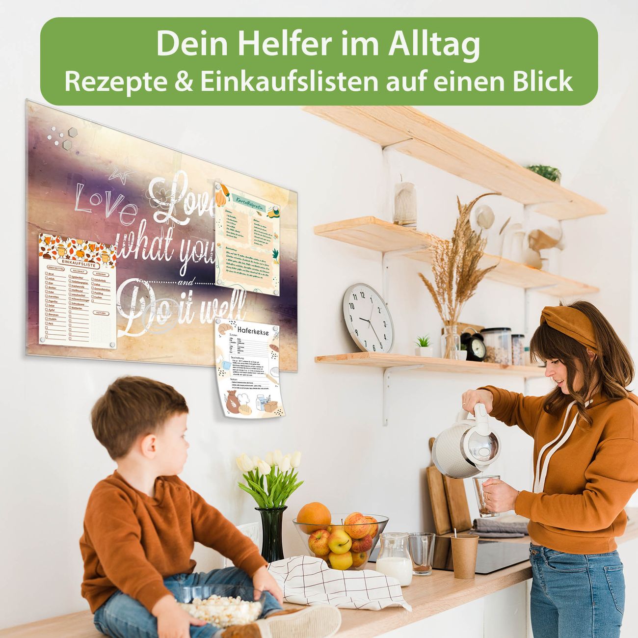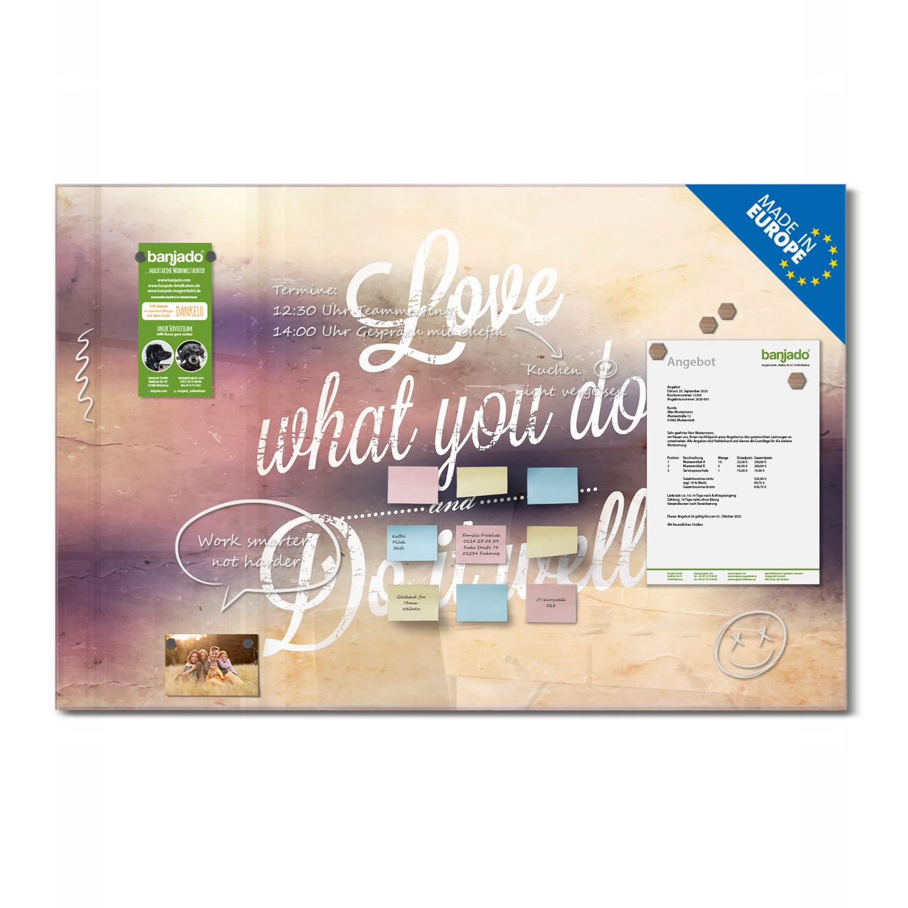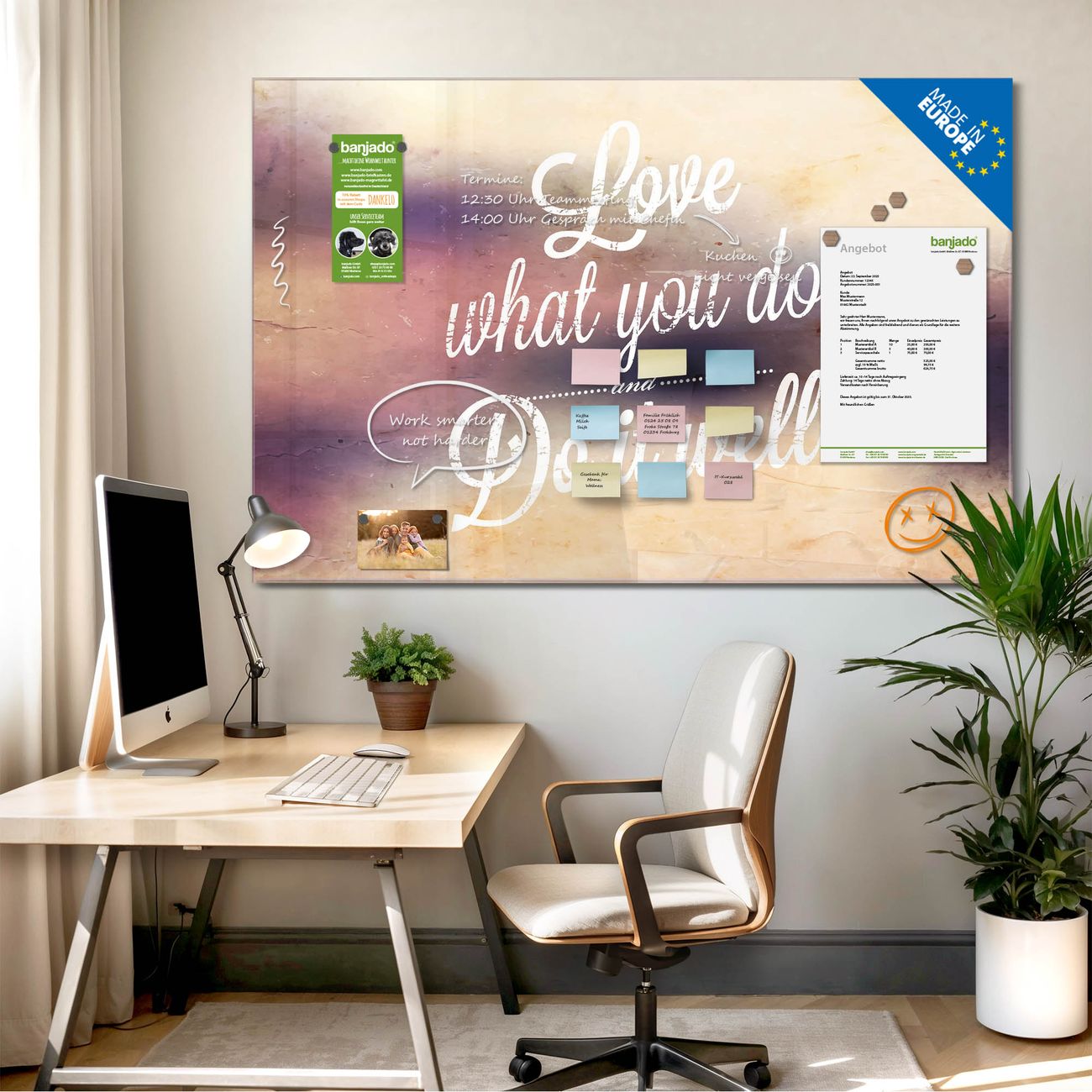 Material: 4mm Sicherheitsglas mit Metallrückwand Eigenschaften: beschreibbar, magnetisch, kratzfest Maße: 120x80x0,6cm, 14,40kg schwer Motiv Nummer 12771 Love What You Do Zubehör: inklusive 4 Neodym-Magnete