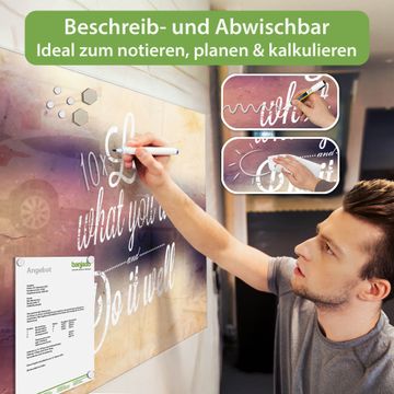 Auf der glatten Glasoberfläche lassen sich Termine, Rezepte oder Notizen ganz einfach mit Kreidestiften festhalten und rückstandslos entfernen. Starke Neodym-Magnete halten Ihre wichtigsten Erinnerungen sicher an Ort und Stelle. So entsteht Ihre ganz persönliche Ideenwand - jeden Tag neu.