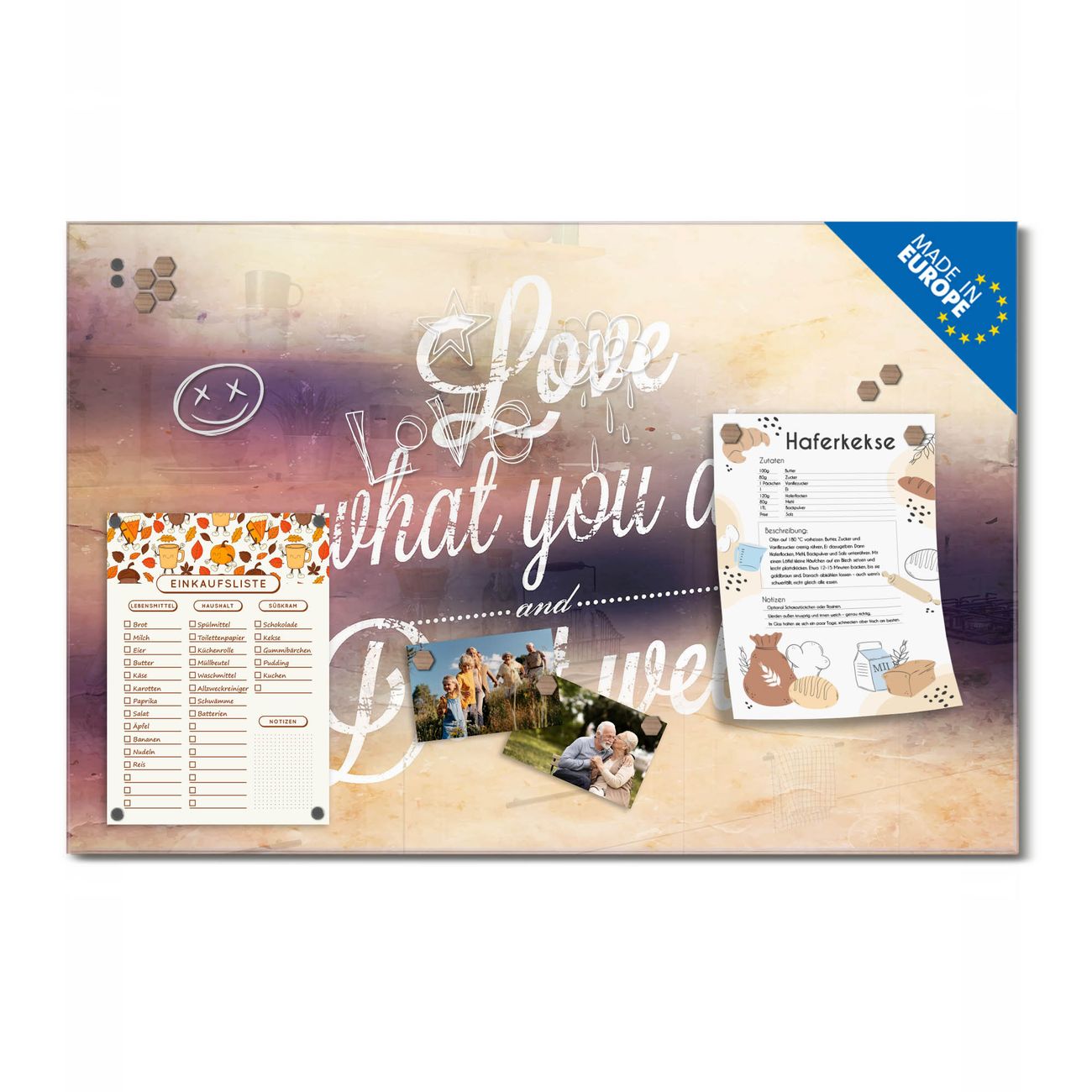 Material: 4mm Sicherheitsglas mit Metallrückwand Eigenschaften: beschreibbar, magnetisch, kratzfest Maße: 75x50x0,6cm, 5,63kg schwer Motiv Nummer 12771 Love What You Do Zubehör: inklusive 4 Neodym-Magnete