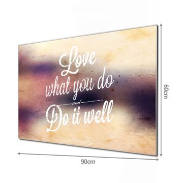 Material: 4mm Sicherheitsglas mit Metallrückwand Eigenschaften: beschreibbar, magnetisch, kratzfest Maße: 90x60x0,6cm, 8,10kg schwer Motiv Nummer 12771 Love What You Do Zubehör: inklusive 4 Neodym-Magnete