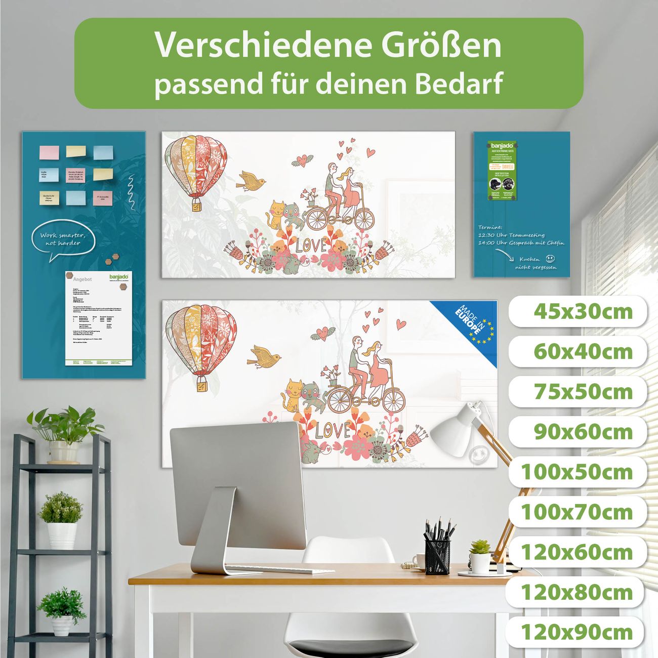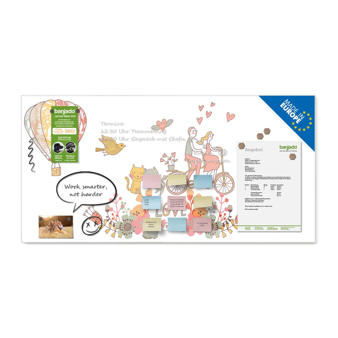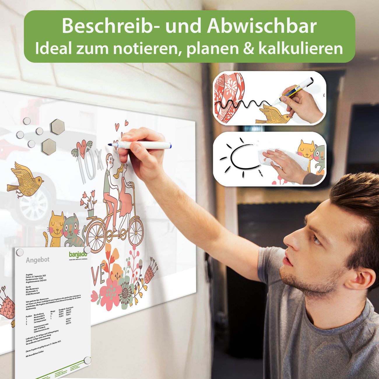 Material: 4mm Sicherheitsglas mit Metallrückwand Eigenschaften: beschreibbar, magnetisch, kratzfest Maße: 120x60x0,6cm, 10,80kg schwer Motiv Nummer 11396 Love Zubehör: inklusive 4 Neodym-Magnete