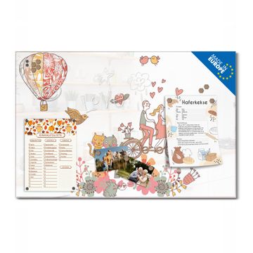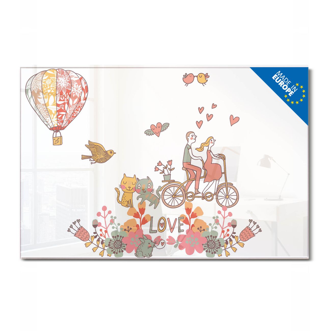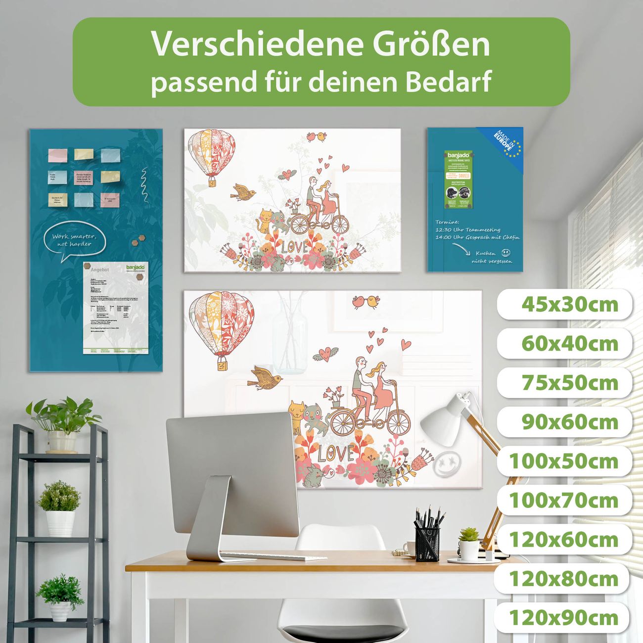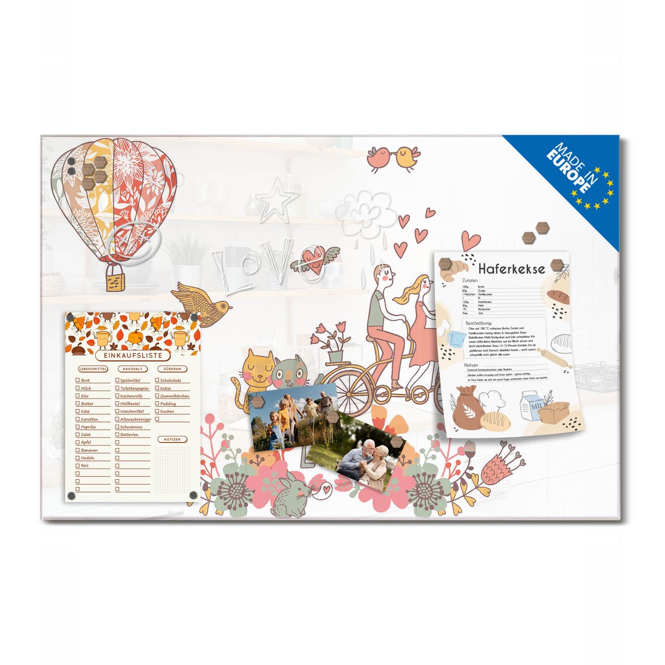 Material: 4mm Sicherheitsglas mit Metallrückwand Eigenschaften: beschreibbar, magnetisch, kratzfest Maße: 75x50x0,6cm, 5,63kg schwer Motiv Nummer 11396 Love Zubehör: inklusive 4 Neodym-Magnete