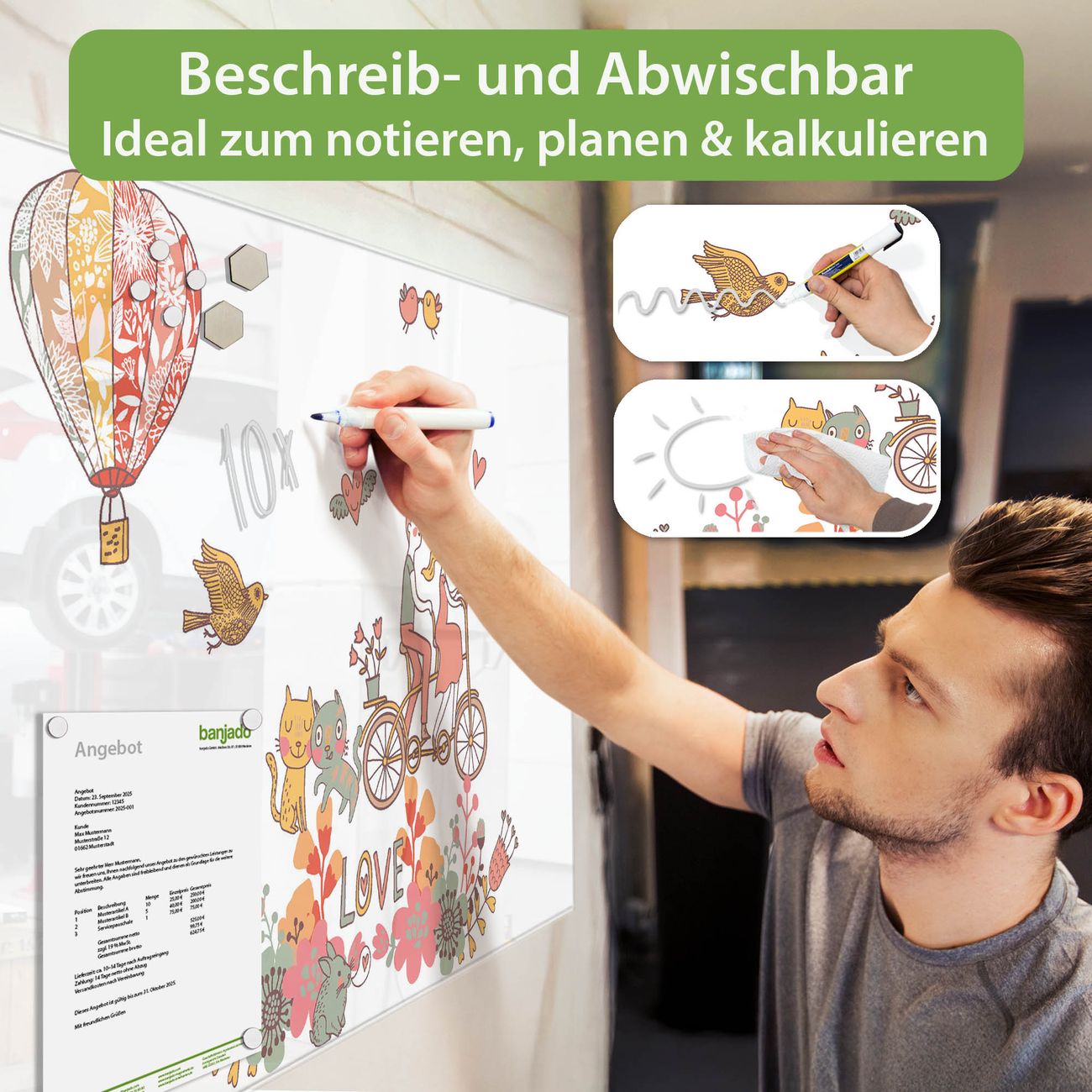 Auf der glatten Glasoberfläche lassen sich Termine, Rezepte oder Notizen ganz einfach mit Kreidestiften festhalten und rückstandslos entfernen. Starke Neodym-Magnete halten Ihre wichtigsten Erinnerungen sicher an Ort und Stelle. So entsteht Ihre ganz persönliche Ideenwand - jeden Tag neu.