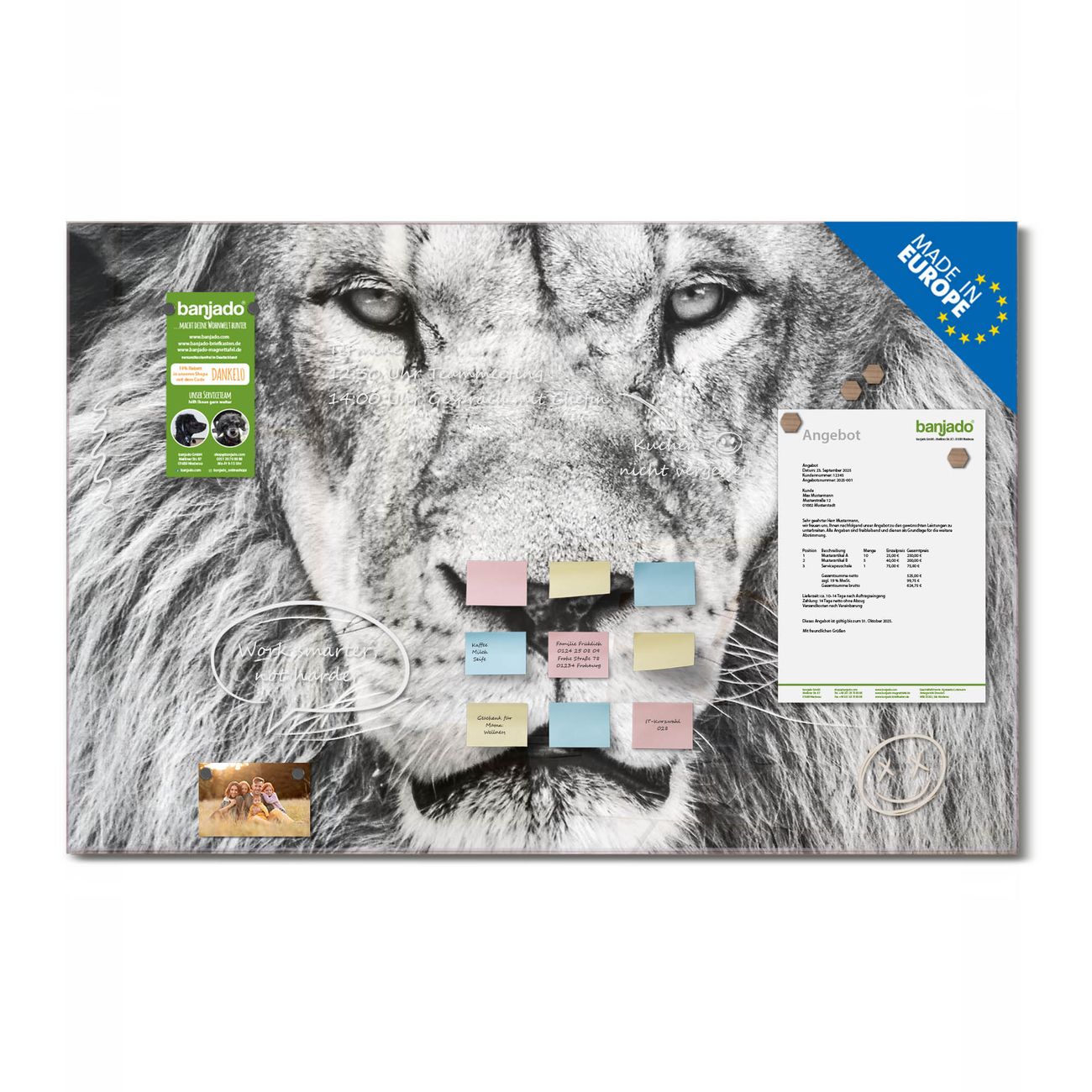 Jede Glas Magnettafel wird in unserer Werkstatt von Hand gefertigt und sorgfältig geprüft. So erhalten Sie ein echtes Qualitätsprodukt, das Funktion und Ästhetik perfekt vereint.?? Warum banjado?