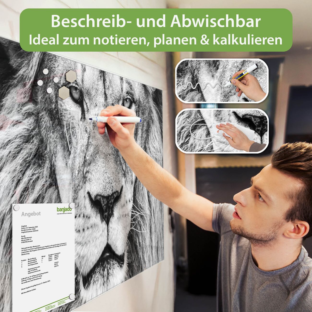 Bitte beachten Sie, dass ausschliessliche spezielle Magnete an der Glastafel haften. Wir empfehlen banjado Neodym Magnete, diese sind durch uns auf Wirksamkeit geprüft.