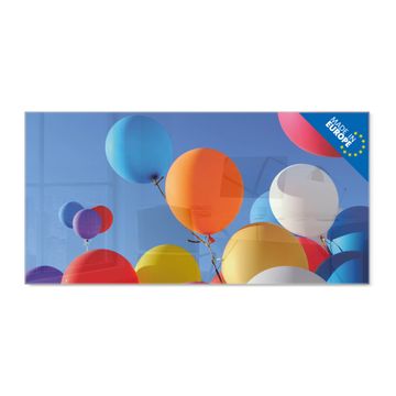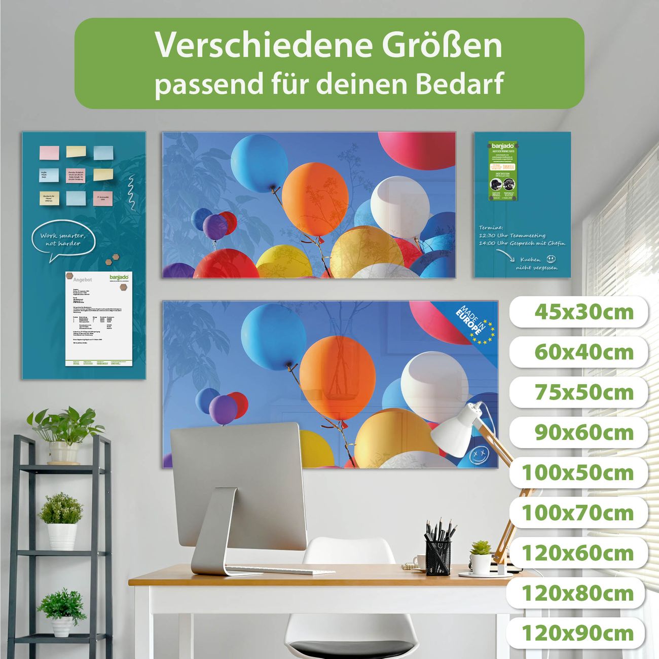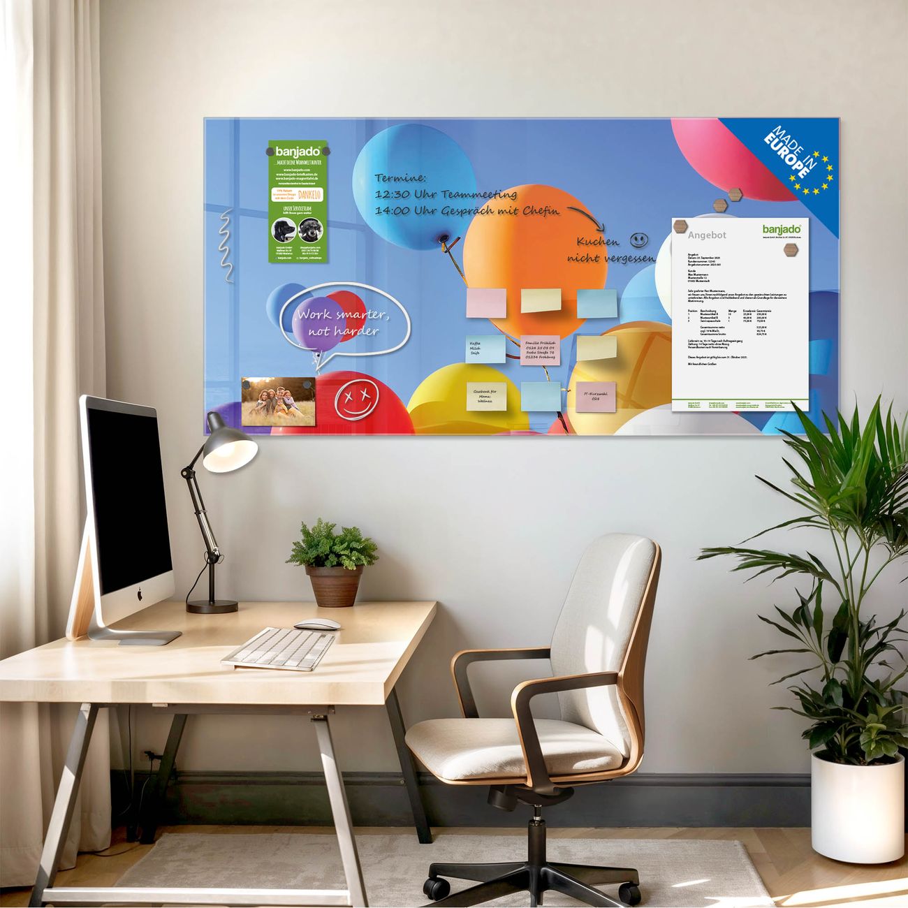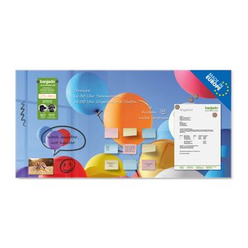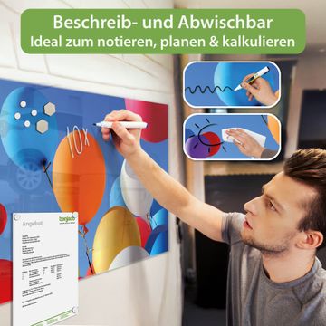 Material: 4mm Sicherheitsglas mit Metallrückwand Eigenschaften: beschreibbar, magnetisch, kratzfest Maße: 100x50x0,6cm, 7,50kg schwer Motiv Nummer 10276 Luftballons Zubehör: inklusive 4 Neodym-Magnete
