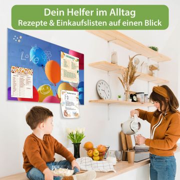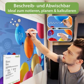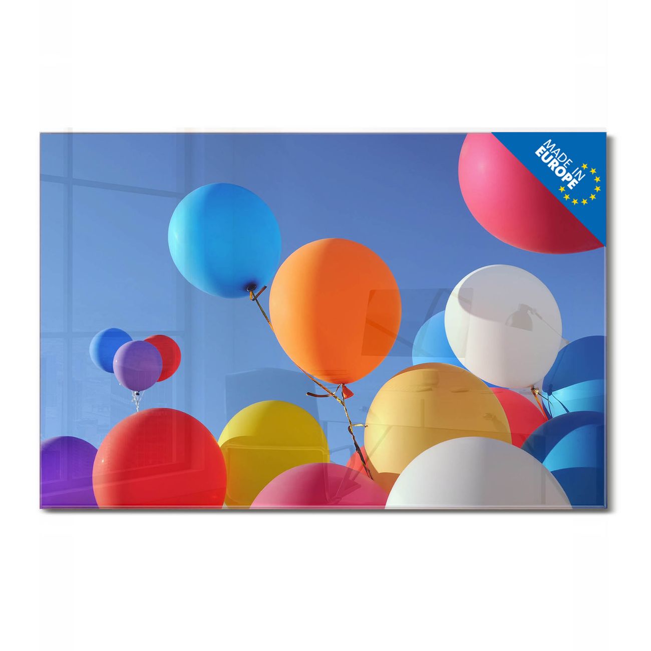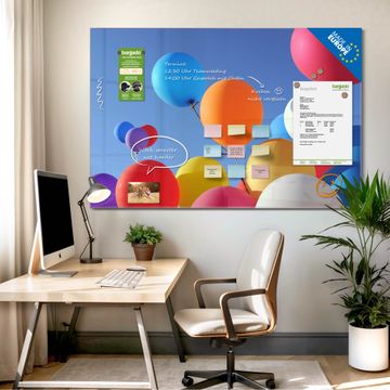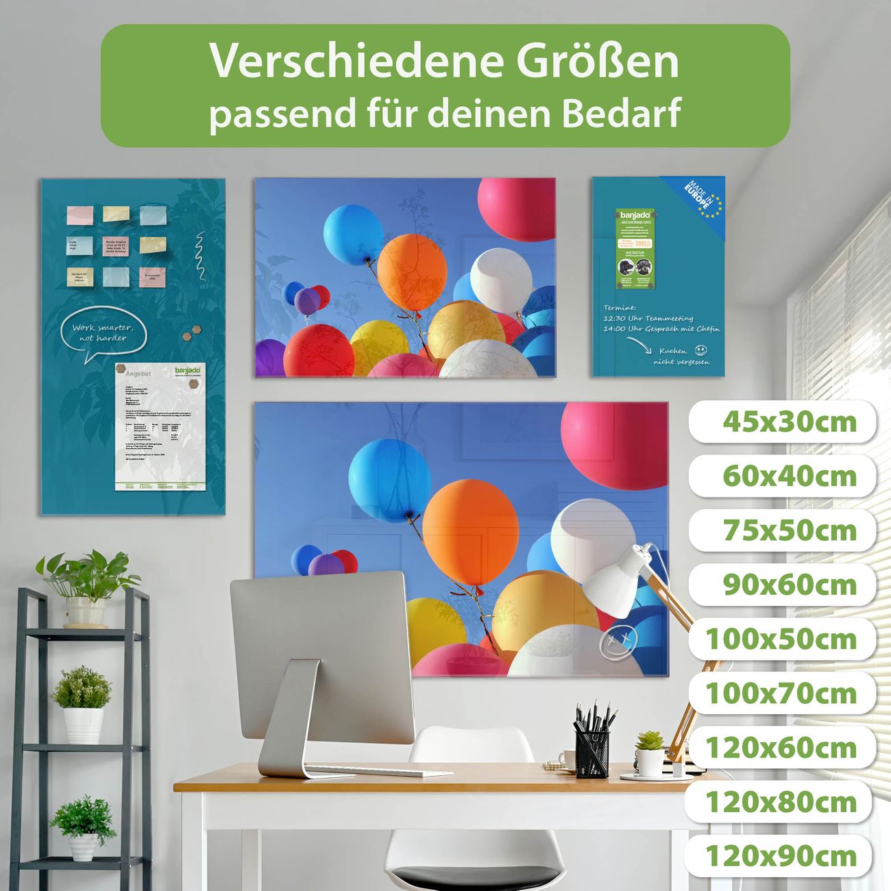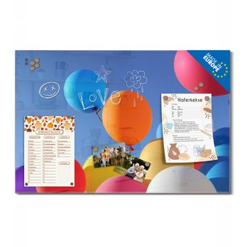 Material: 4mm Sicherheitsglas mit Metallrückwand Eigenschaften: beschreibbar, magnetisch, kratzfest Maße: 45x30x0,6cm, 2,03kg schwer Motiv Nummer 10276 Luftballons Zubehör: inklusive 4 Neodym-Magnete