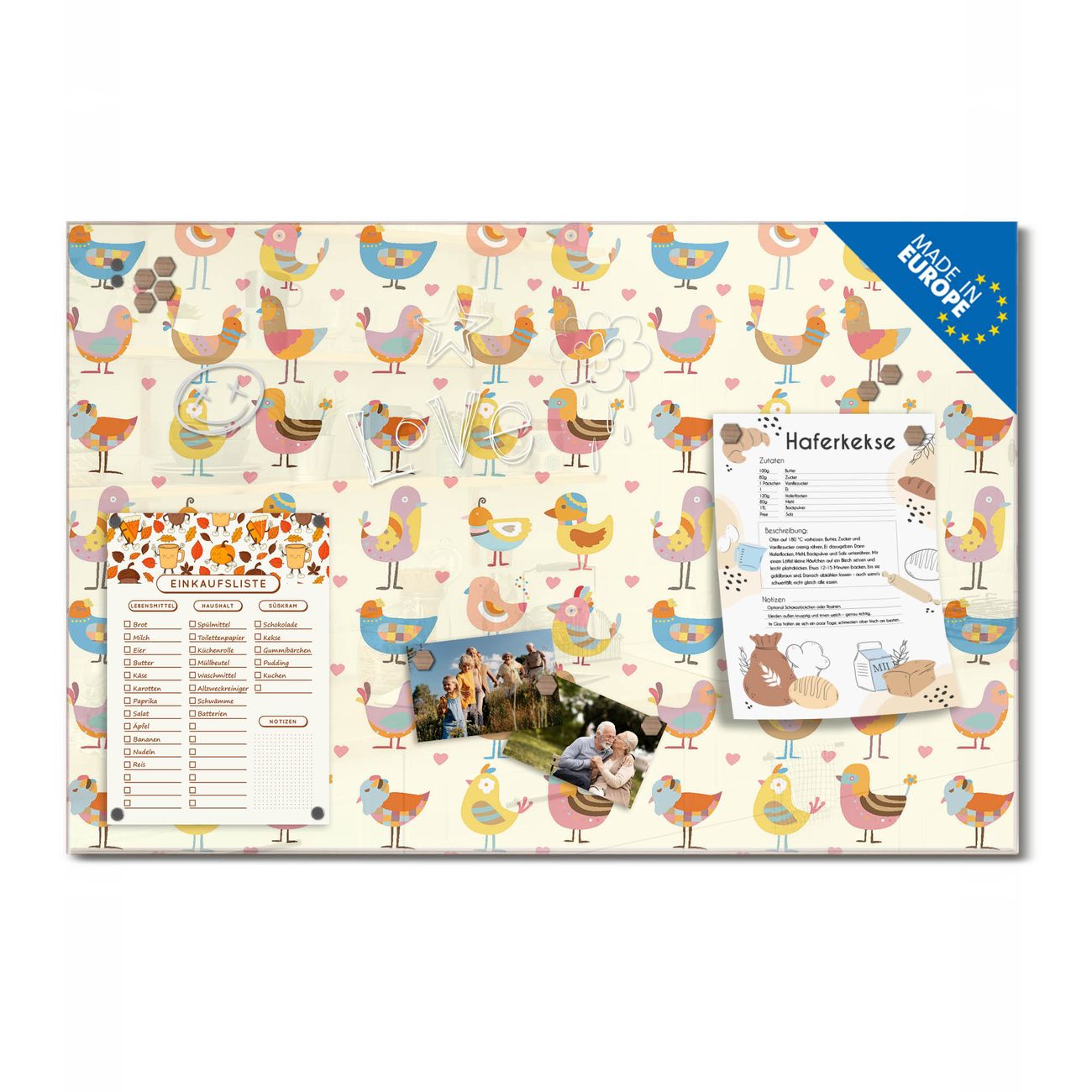 Material: 4mm Sicherheitsglas mit Metallrückwand Eigenschaften: beschreibbar, magnetisch, kratzfest Maße: 75x50x0,6cm, 5,63kg schwer Motiv Nummer 11543 Lustige Vögel Zubehör: inklusive 4 Neodym-Magnete