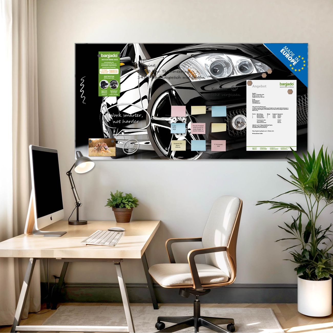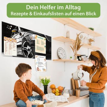 Material: 4mm Sicherheitsglas mit Metallrückwand Eigenschaften: beschreibbar, magnetisch, kratzfest Maße: 100x50x0,6cm, 7,50kg schwer Motiv Nummer 10177 Luxus Car Zubehör: inklusive 4 Neodym-Magnete