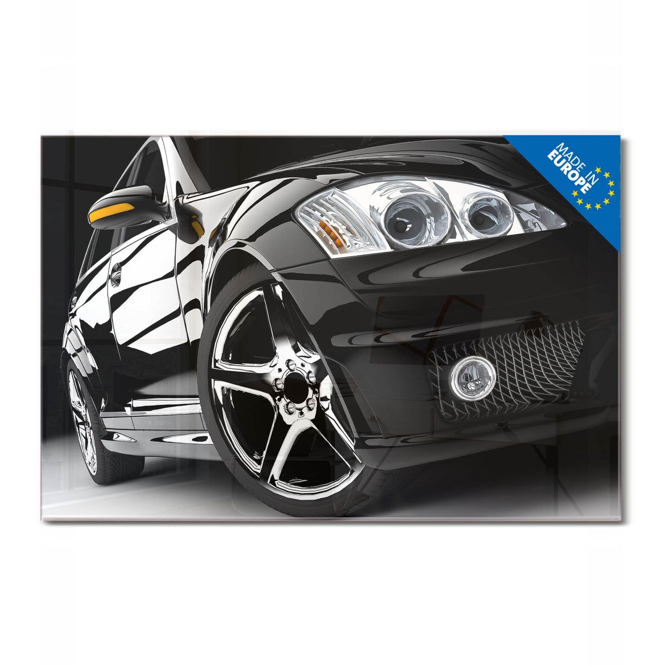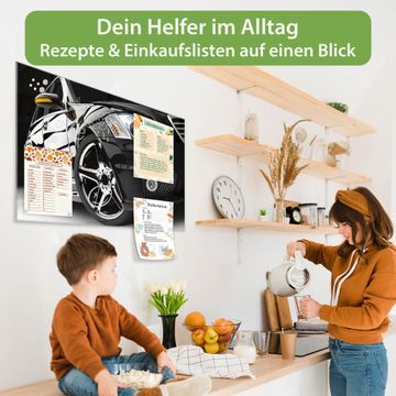 Material: 4mm Sicherheitsglas mit Metallrückwand Eigenschaften: beschreibbar, magnetisch, kratzfest Maße: 75x50x0,6cm, 5,63kg schwer Motiv Nummer 10177 Luxus Car Zubehör: inklusive 4 Neodym-Magnete