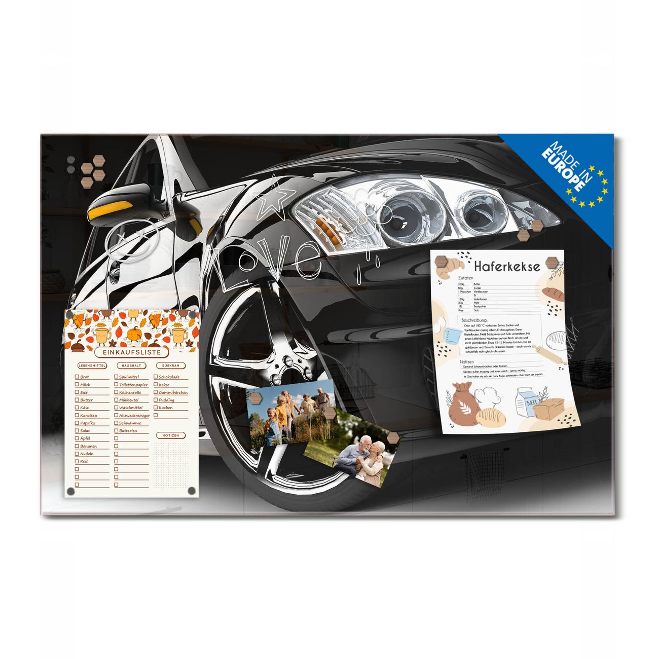 Ein Stück Design, das Ihren Alltag organisiert. Schreiben, heften, inspirieren - alles an einem Ort. Qualität, die man spürt. Montage leicht gemacht. Handwerk mit Herz - veredelt in Sachsen. Einzigartiges Design mit Motiv Motiv Luxus Car Beschreibbare Glasoberfläche, leicht zu reinigen Starke Magnetkraft durch Stahlrückwand Inklusive 4 Neodym-Magneten Flexible Montageoptionen Handveredelt in Sachsen - Qualität, die bleibt