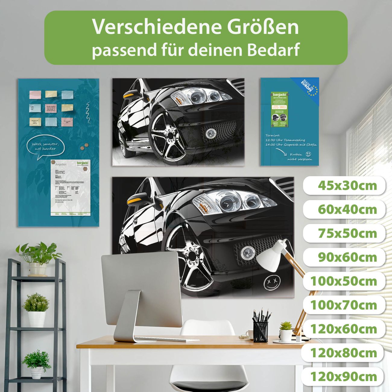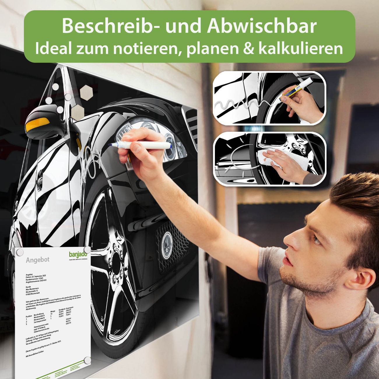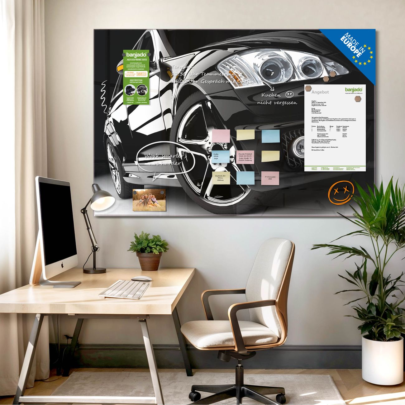 Jede Glas Magnettafel wird in unserer Werkstatt von Hand gefertigt und sorgfältig geprüft. So erhalten Sie ein echtes Qualitätsprodukt, das Funktion und Ästhetik perfekt vereint.?? Warum banjado?