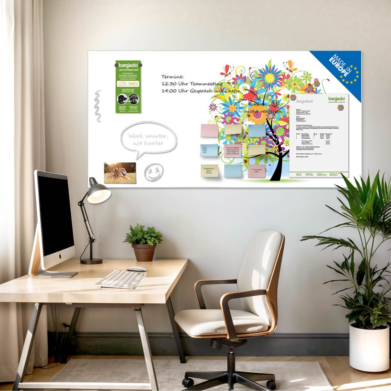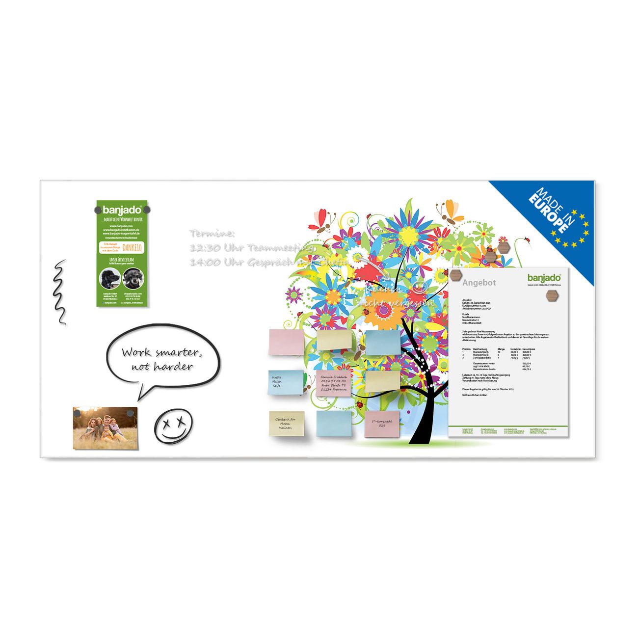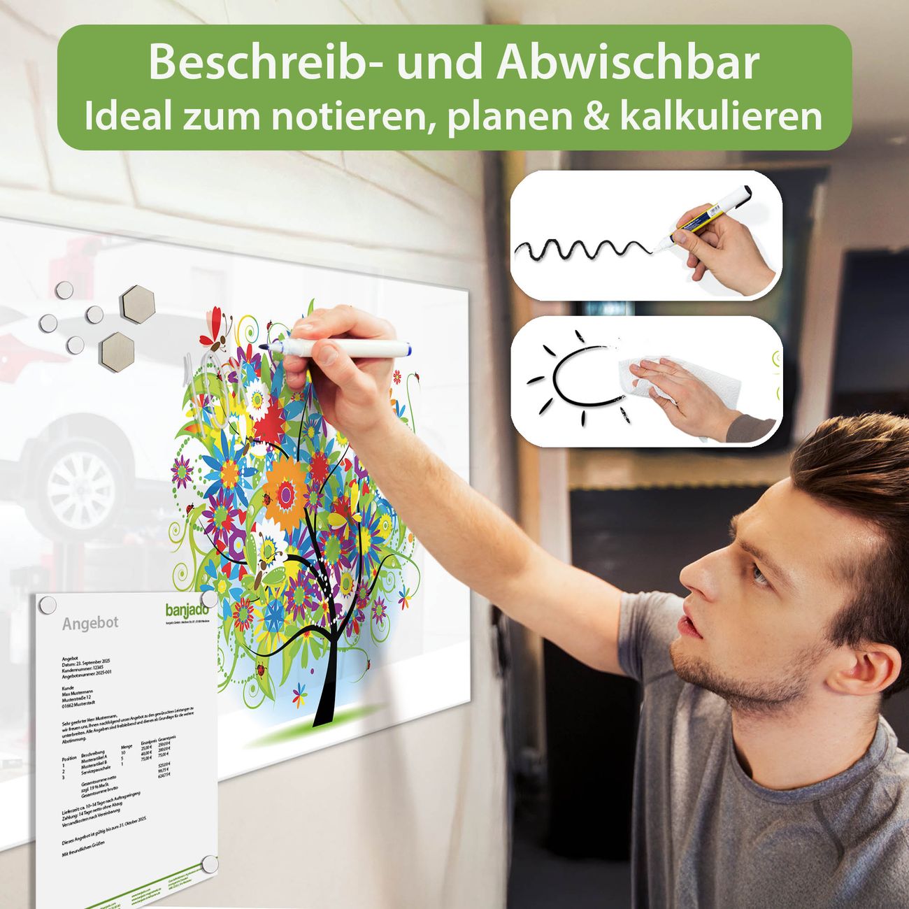 Jede Glas Magnettafel wird in unserer Werkstatt von Hand gefertigt und sorgfältig geprüft. So erhalten Sie ein echtes Qualitätsprodukt, das Funktion und Ästhetik perfekt vereint.?? Warum banjado?