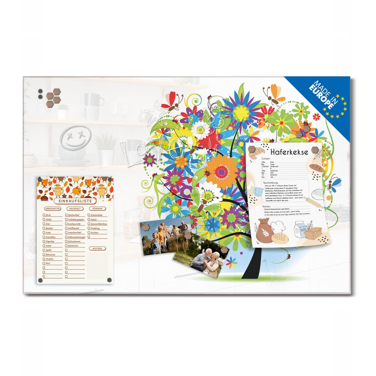 Material: 4mm Sicherheitsglas mit Metallrückwand Eigenschaften: beschreibbar, magnetisch, kratzfest Maße: 45x30x0,6cm, 2,03kg schwer Motiv Nummer 10149 Märchenzauberbaum Zubehör: inklusive 4 Neodym-Magnete