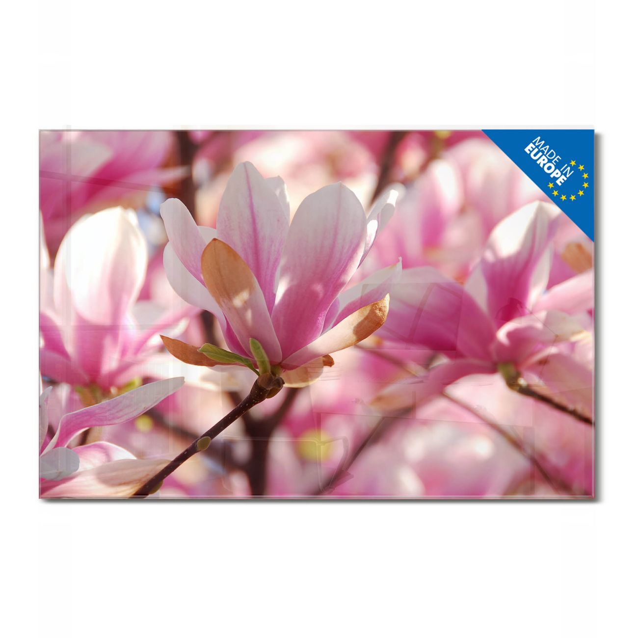 Material: 4mm Sicherheitsglas mit Metallrückwand Eigenschaften: beschreibbar, magnetisch, kratzfest Maße: 120x80x0,6cm, 14,40kg schwer Motiv Nummer 10407 Magnolia Zubehör: inklusive 4 Neodym-Magnete