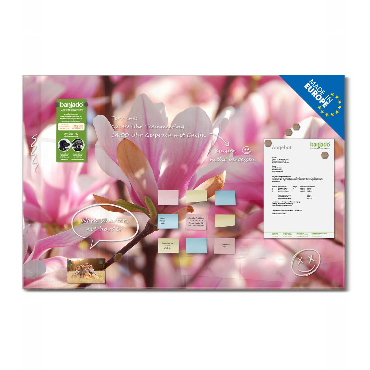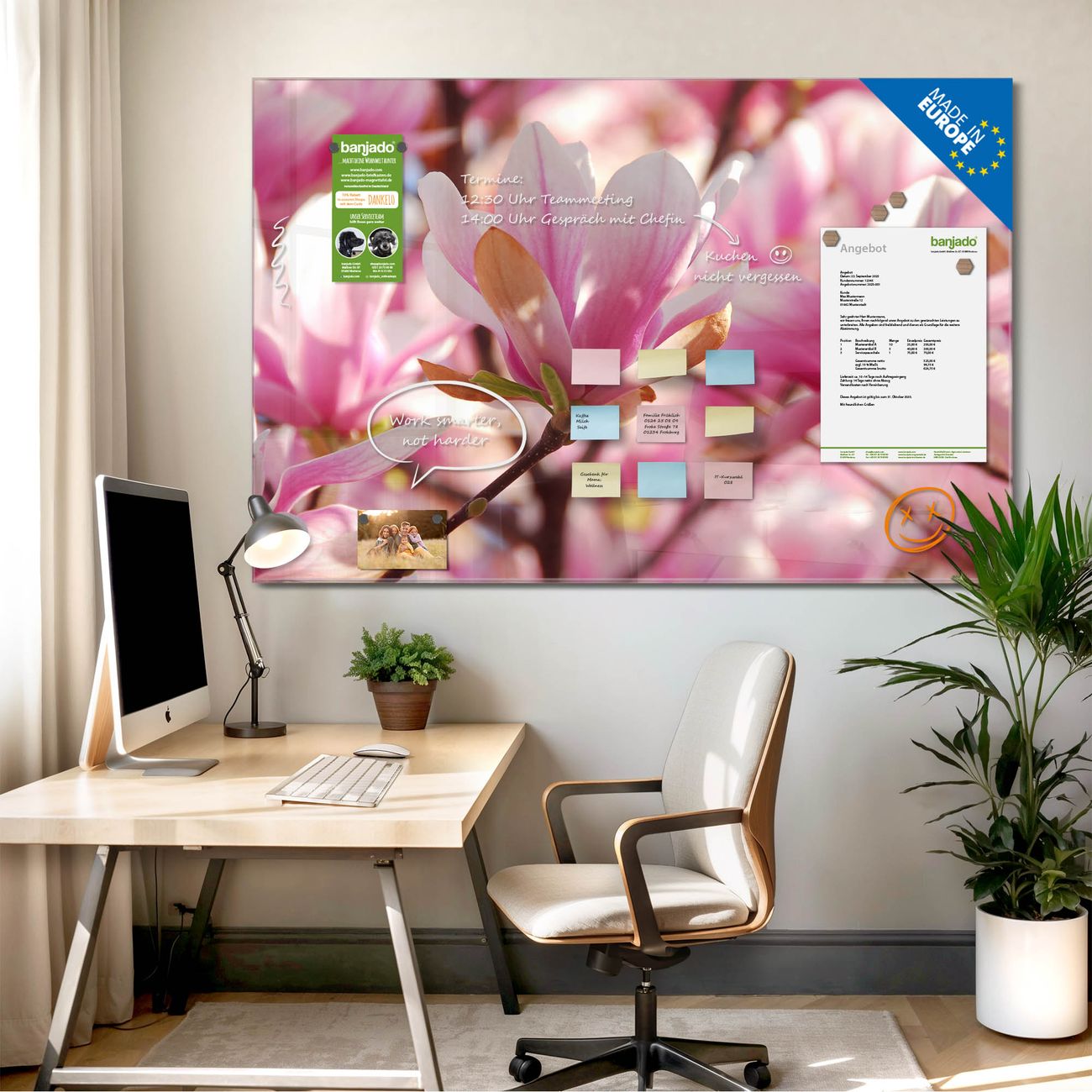 Jede Glas Magnettafel wird in unserer Werkstatt von Hand gefertigt und sorgfältig geprüft. So erhalten Sie ein echtes Qualitätsprodukt, das Funktion und Ästhetik perfekt vereint.?? Warum banjado?