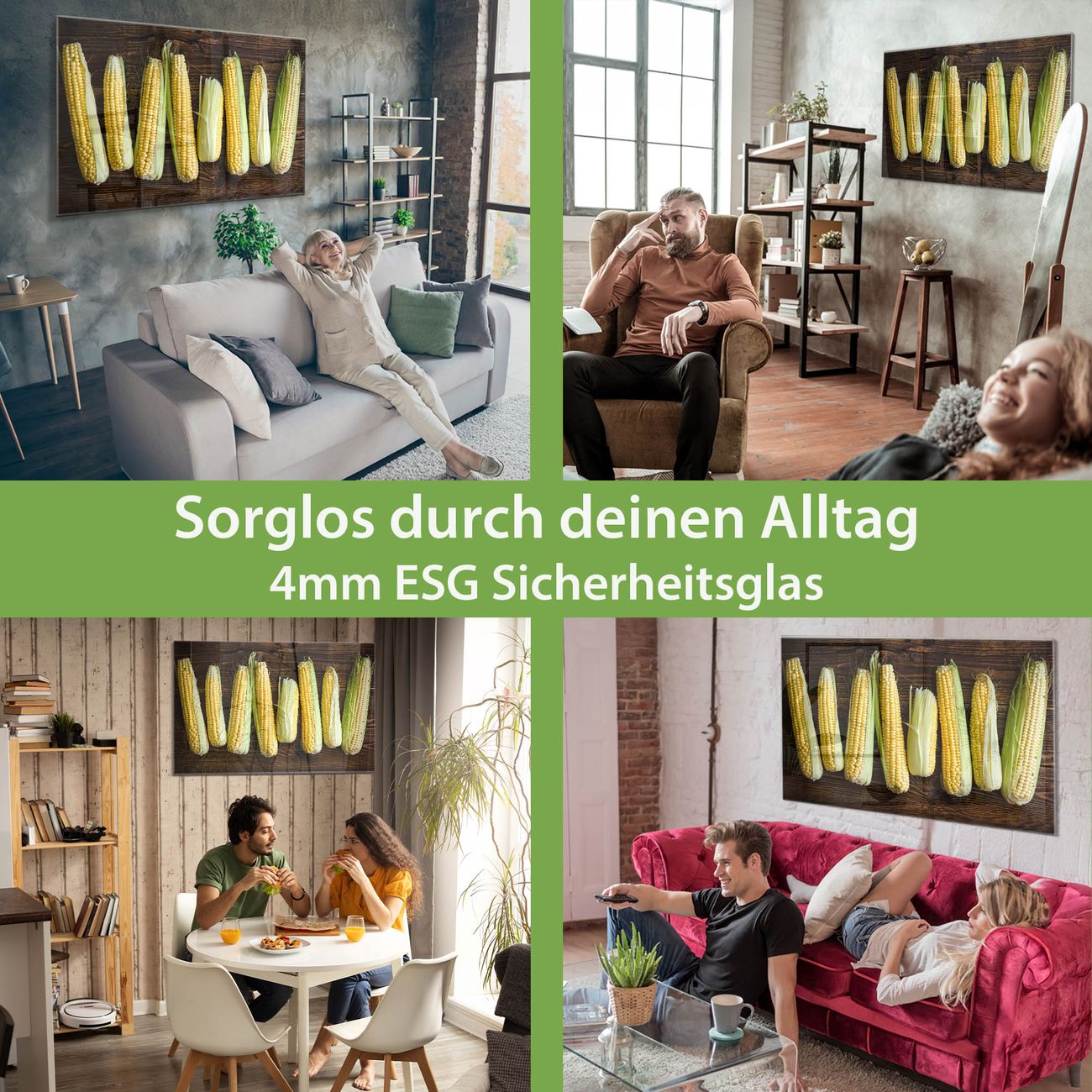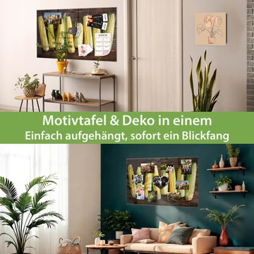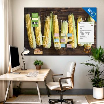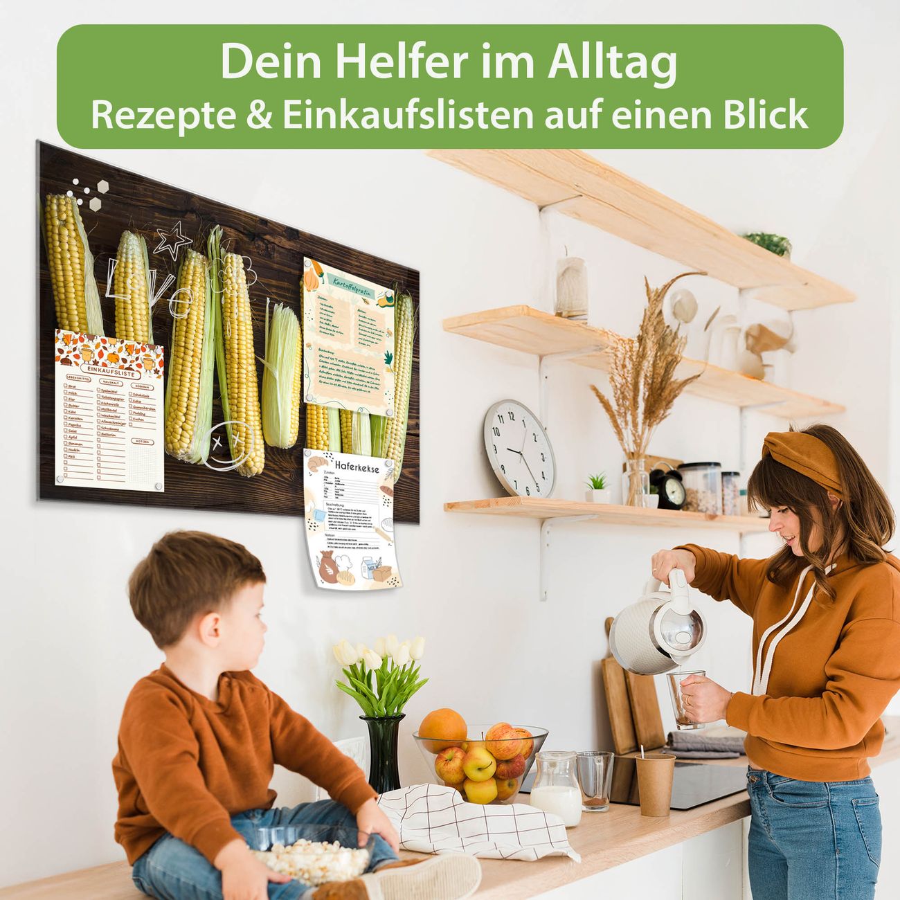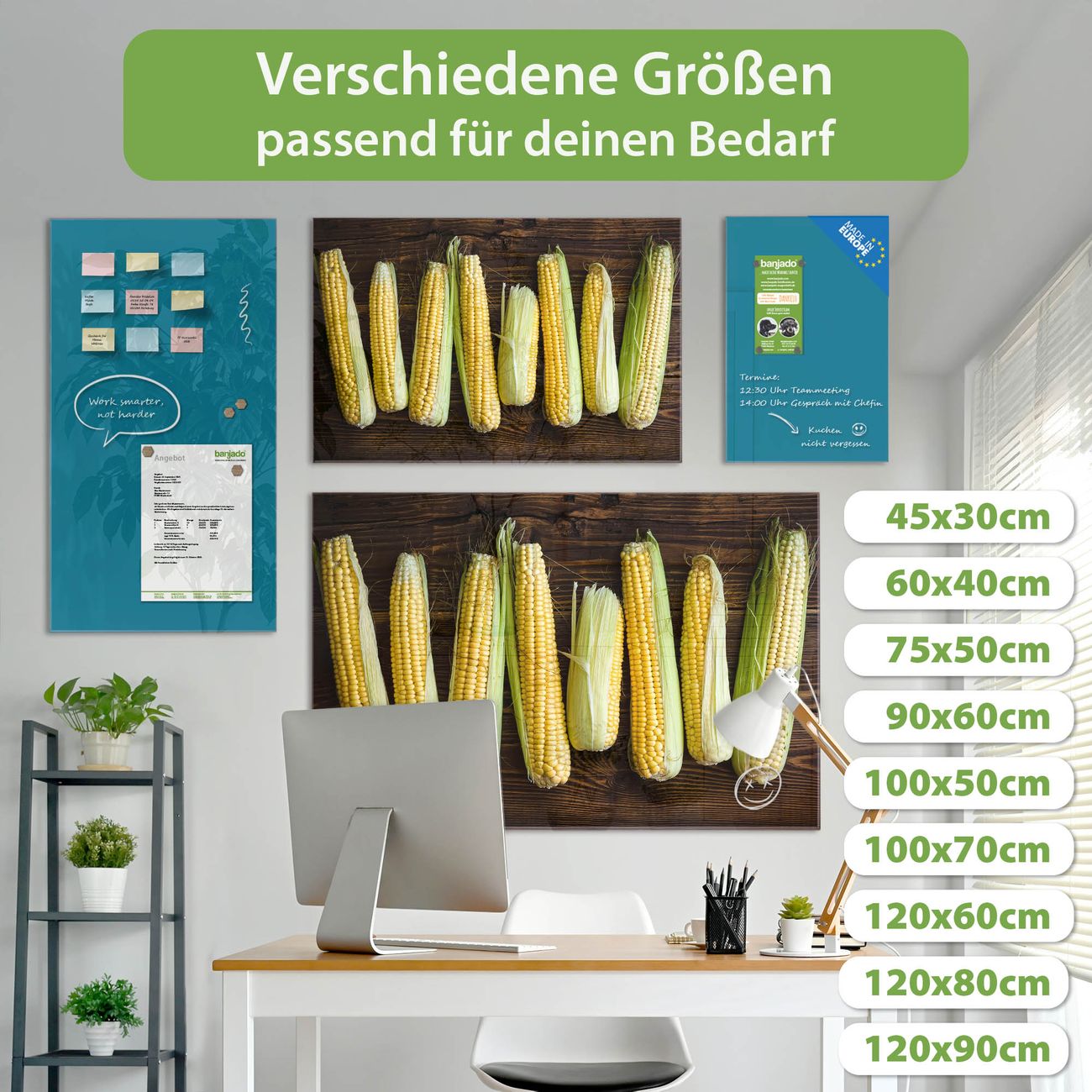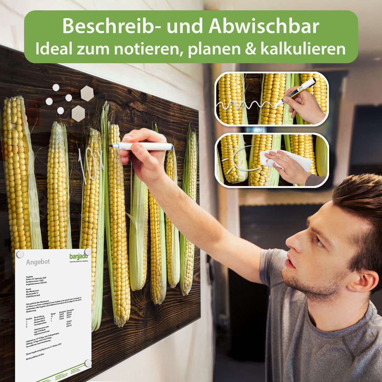 Material: 4mm Sicherheitsglas mit Metallrückwand Eigenschaften: beschreibbar, magnetisch, kratzfest Maße: 100x50x0,6cm, 7,50kg schwer Motiv Nummer 12703 Maiskolben Zubehör: inklusive 4 Neodym-Magnete