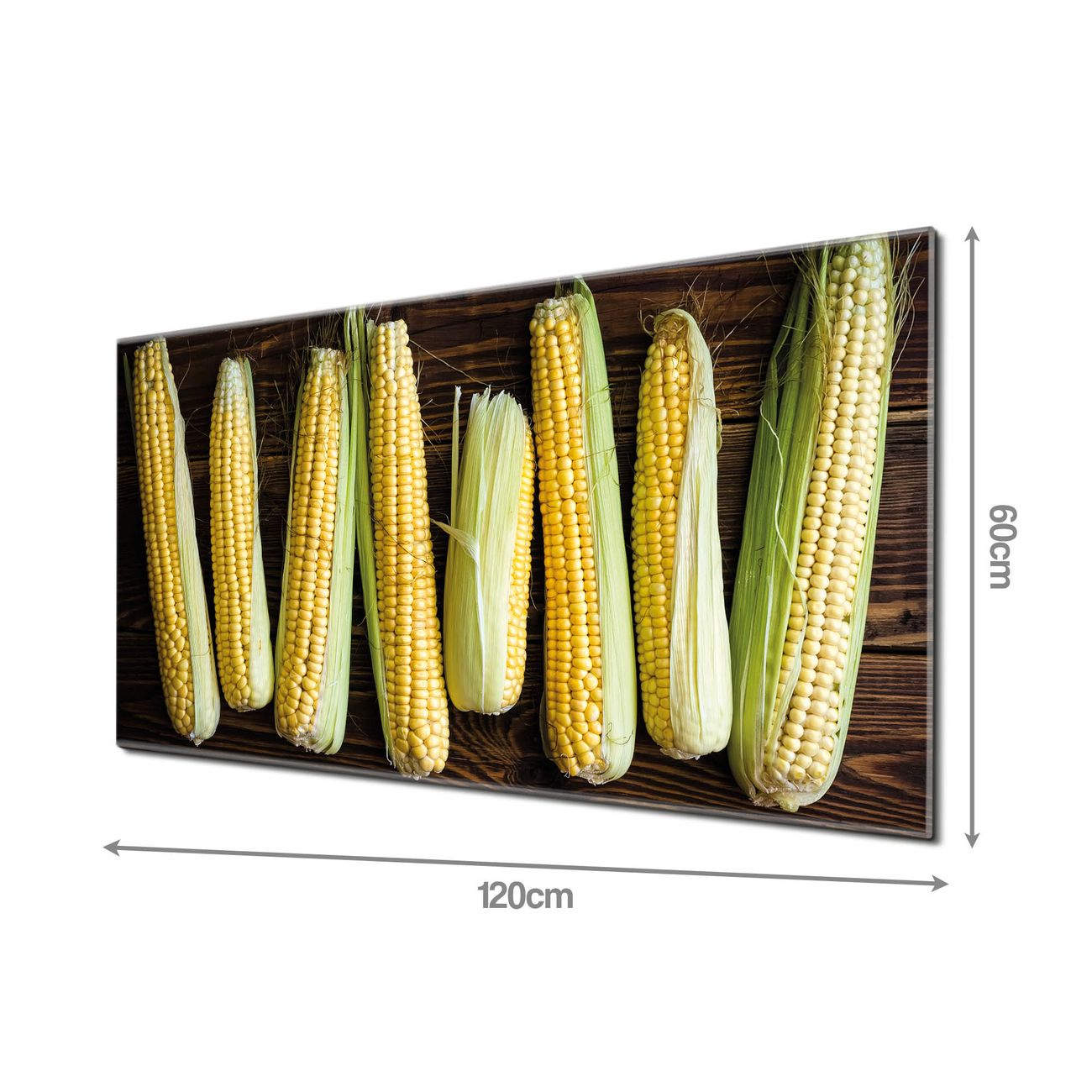 Material: 4mm Sicherheitsglas mit Metallrückwand Eigenschaften: beschreibbar, magnetisch, kratzfest Maße: 120x60x0,6cm, 10,80kg schwer Motiv Nummer 12703 Maiskolben Zubehör: inklusive 4 Neodym-Magnete