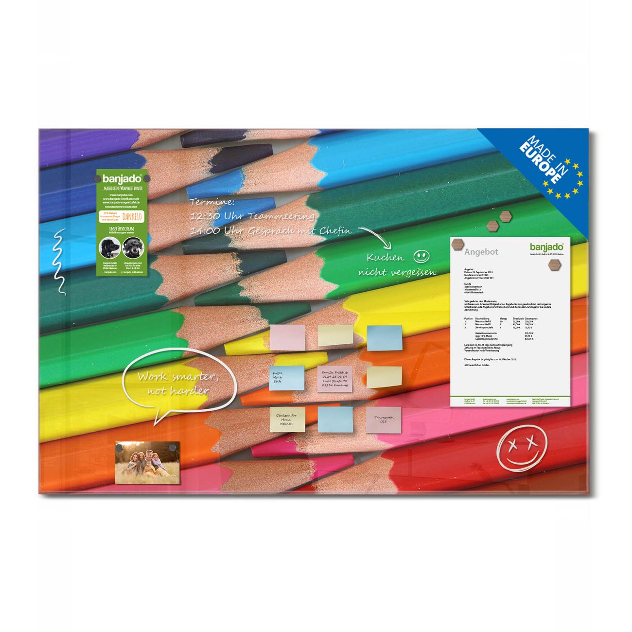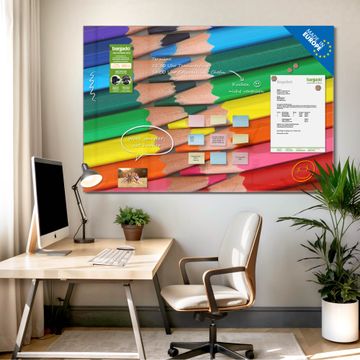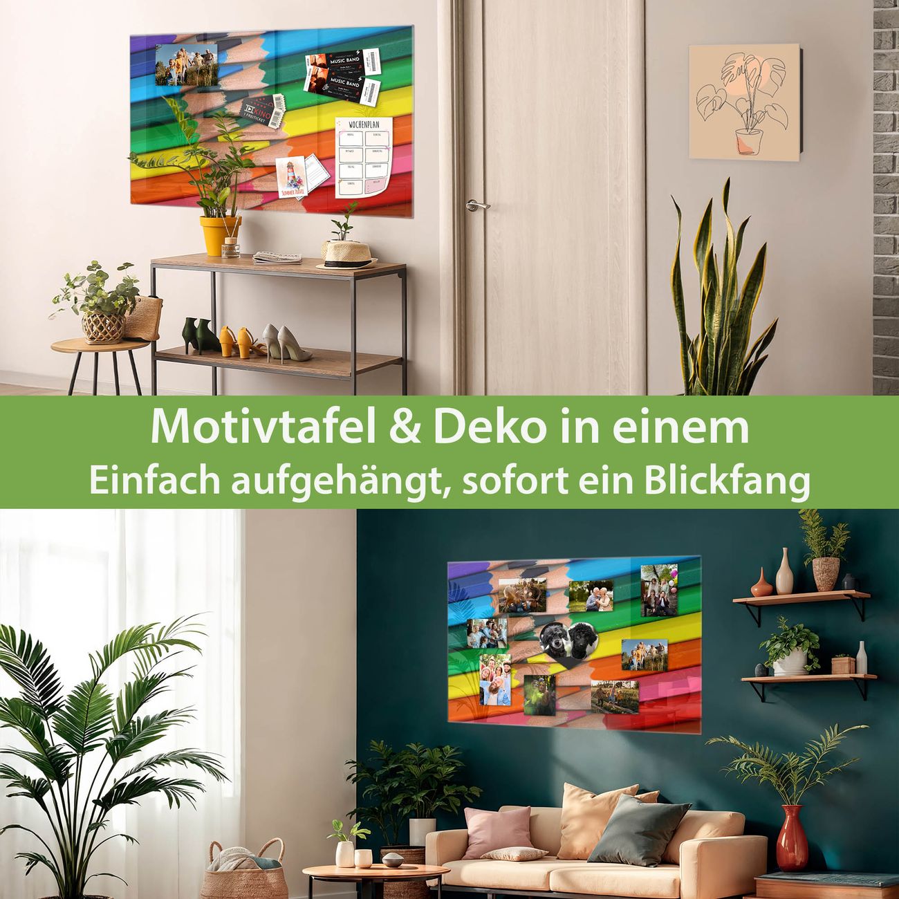 Die banjado Glas Magnettafel mit dem Motiv Motiv Malstifte verbindet Funktionalität mit Stil. Sie ersetzt das Zettelchaos durch klare Strukturen und bringt dabei eine warme, natürliche Atmosphäre in Ihr Zuhause. Ob im Büro, in der Küche oder im Eingangsbereich - dieses Design-Board zieht Blicke an und sorgt für Ordnung mit Charakter.