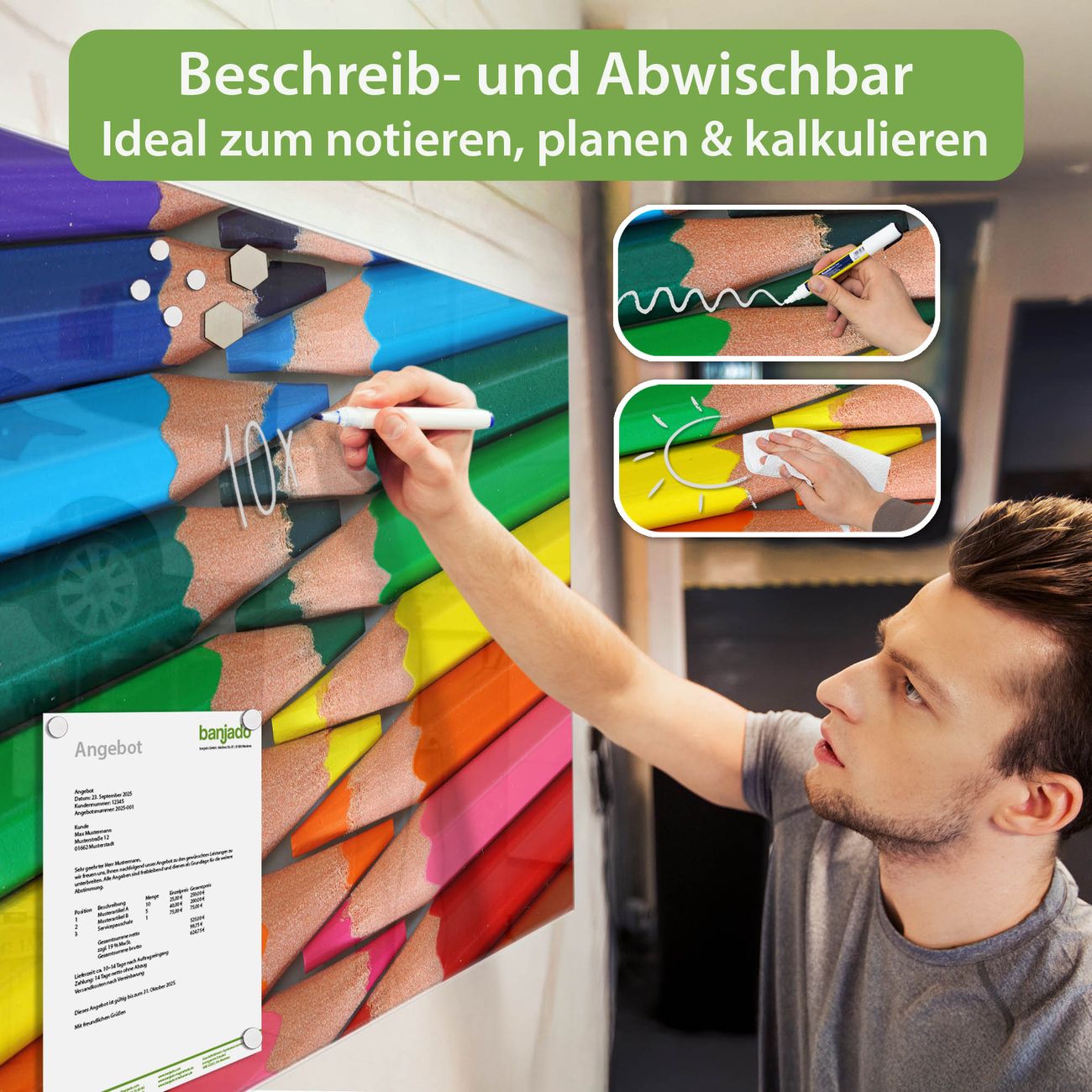 Jede Glas Magnettafel wird in unserer Werkstatt von Hand gefertigt und sorgfältig geprüft. So erhalten Sie ein echtes Qualitätsprodukt, das Funktion und Ästhetik perfekt vereint.?? Warum banjado?