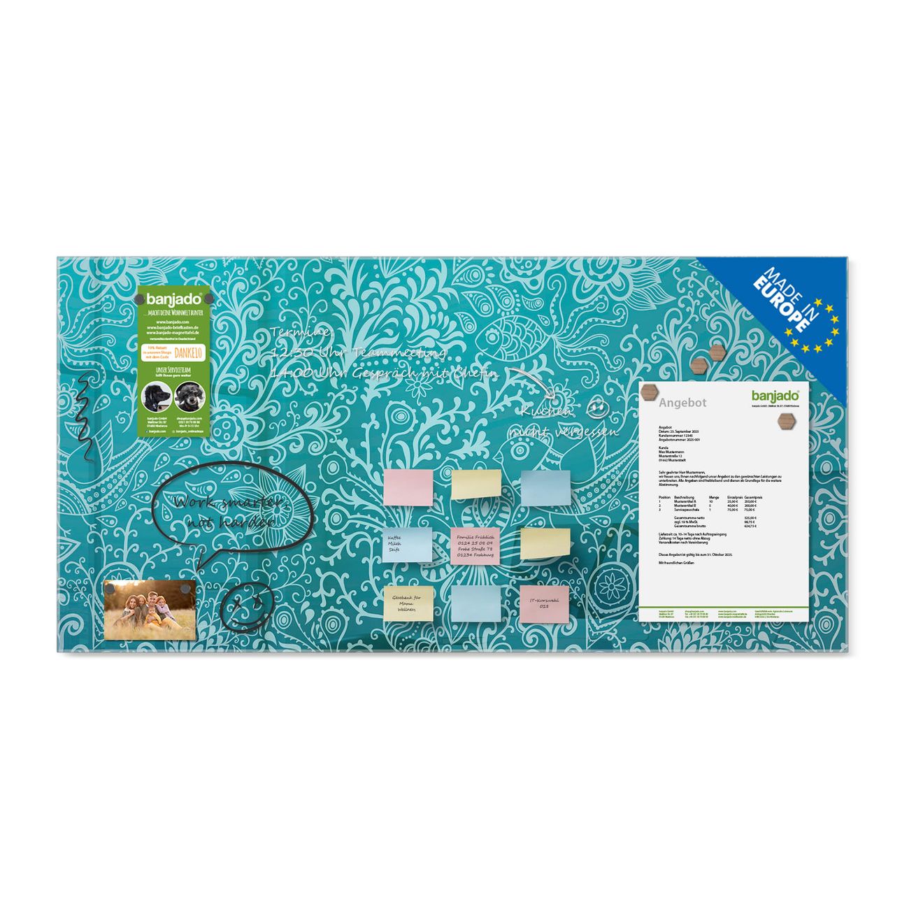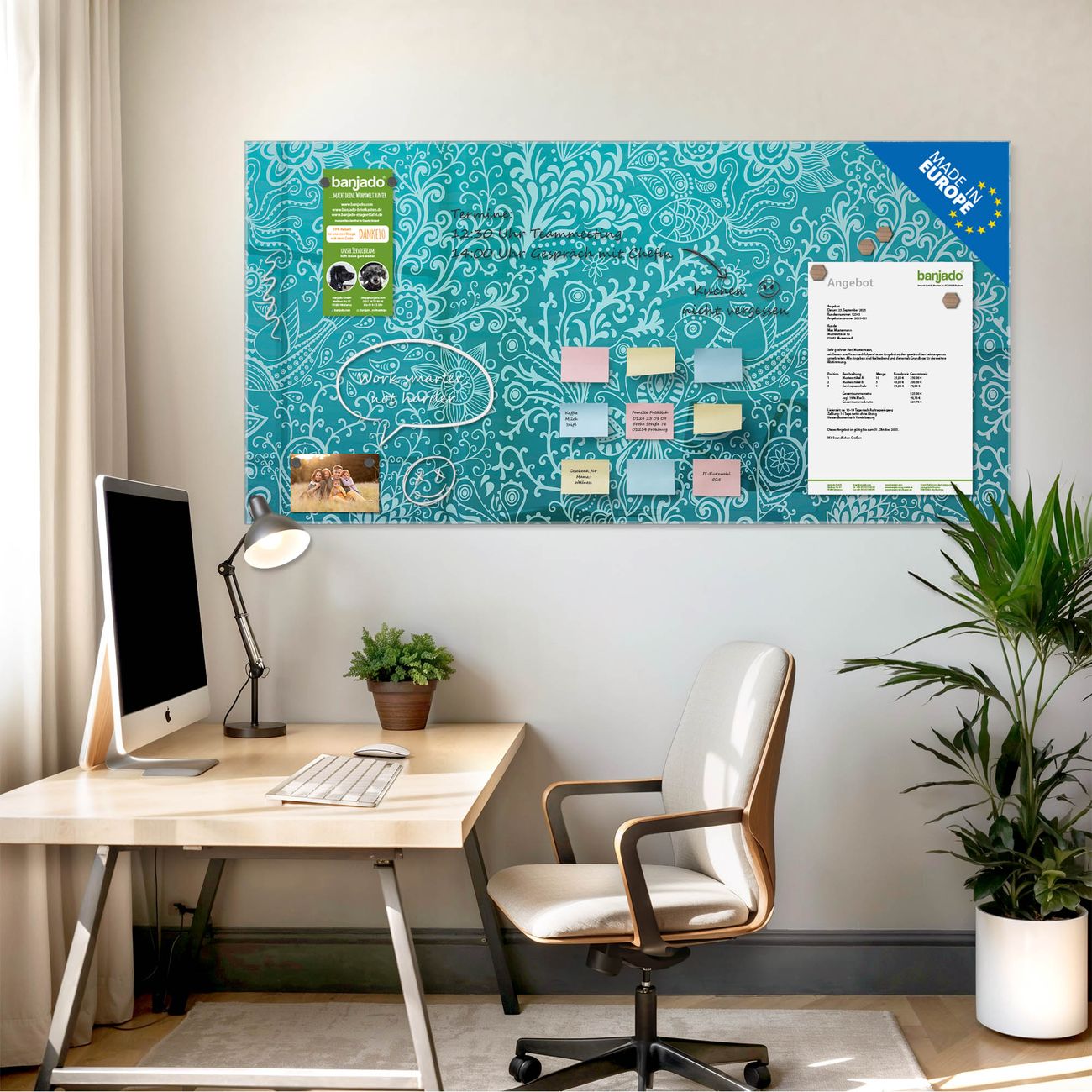 Jede Glas Magnettafel wird in unserer Werkstatt von Hand gefertigt und sorgfältig geprüft. So erhalten Sie ein echtes Qualitätsprodukt, das Funktion und Ästhetik perfekt vereint.?? Warum banjado?