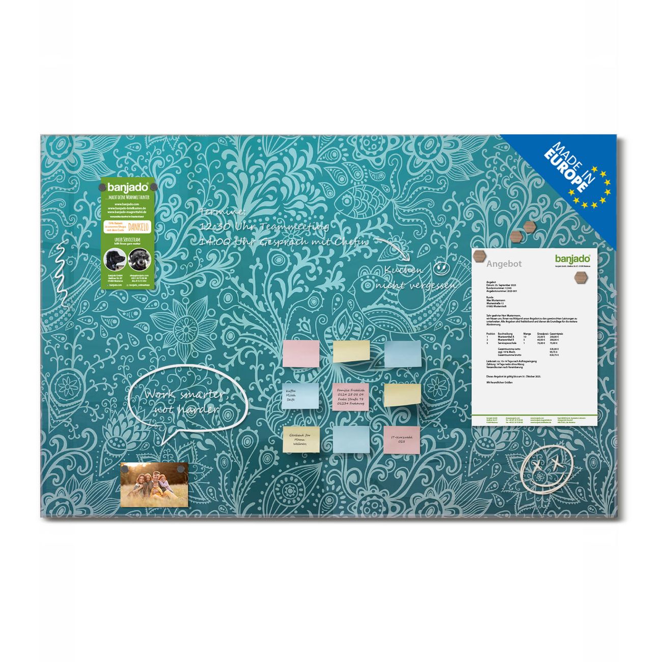 Jede Glas Magnettafel wird in unserer Werkstatt von Hand gefertigt und sorgfältig geprüft. So erhalten Sie ein echtes Qualitätsprodukt, das Funktion und Ästhetik perfekt vereint.?? Warum banjado?