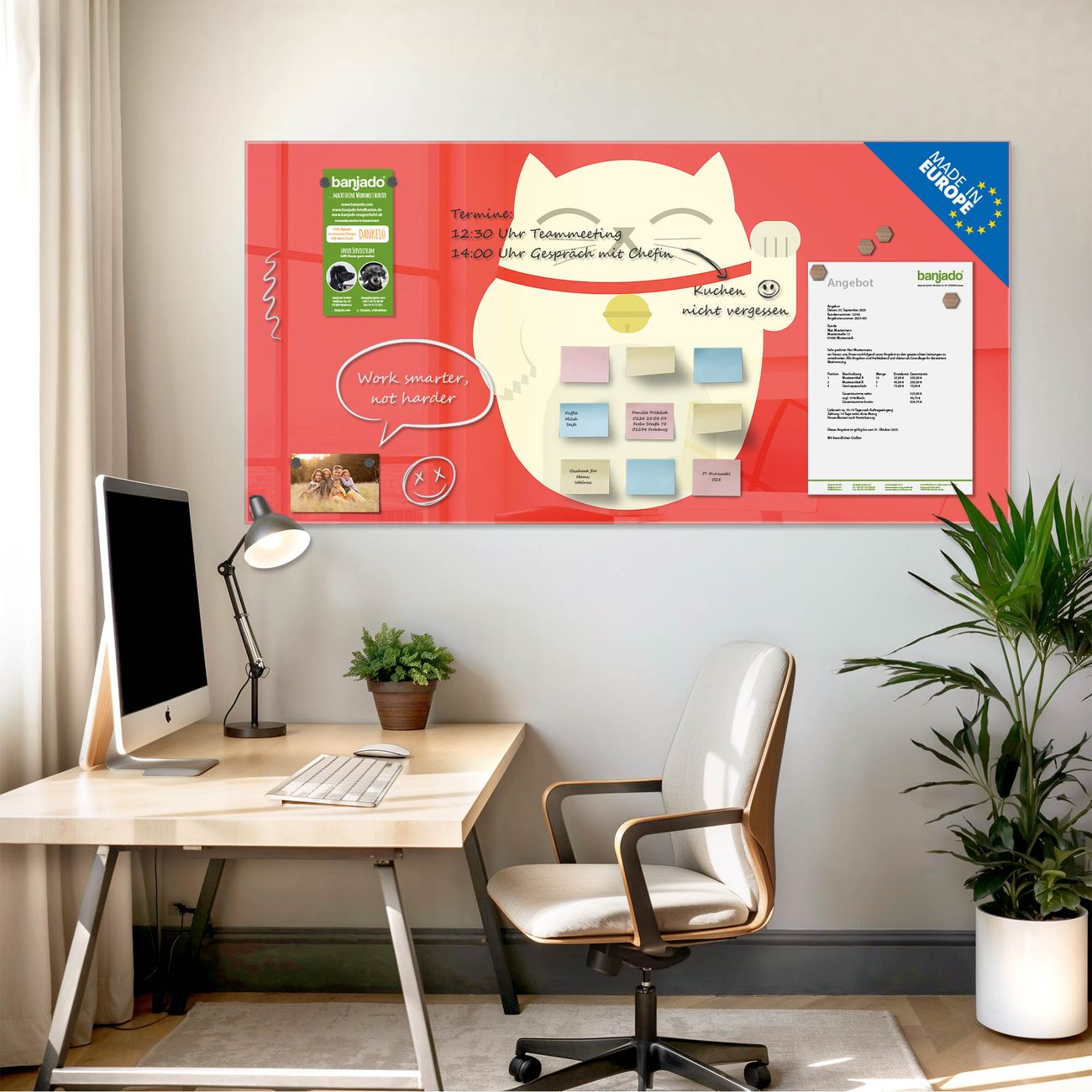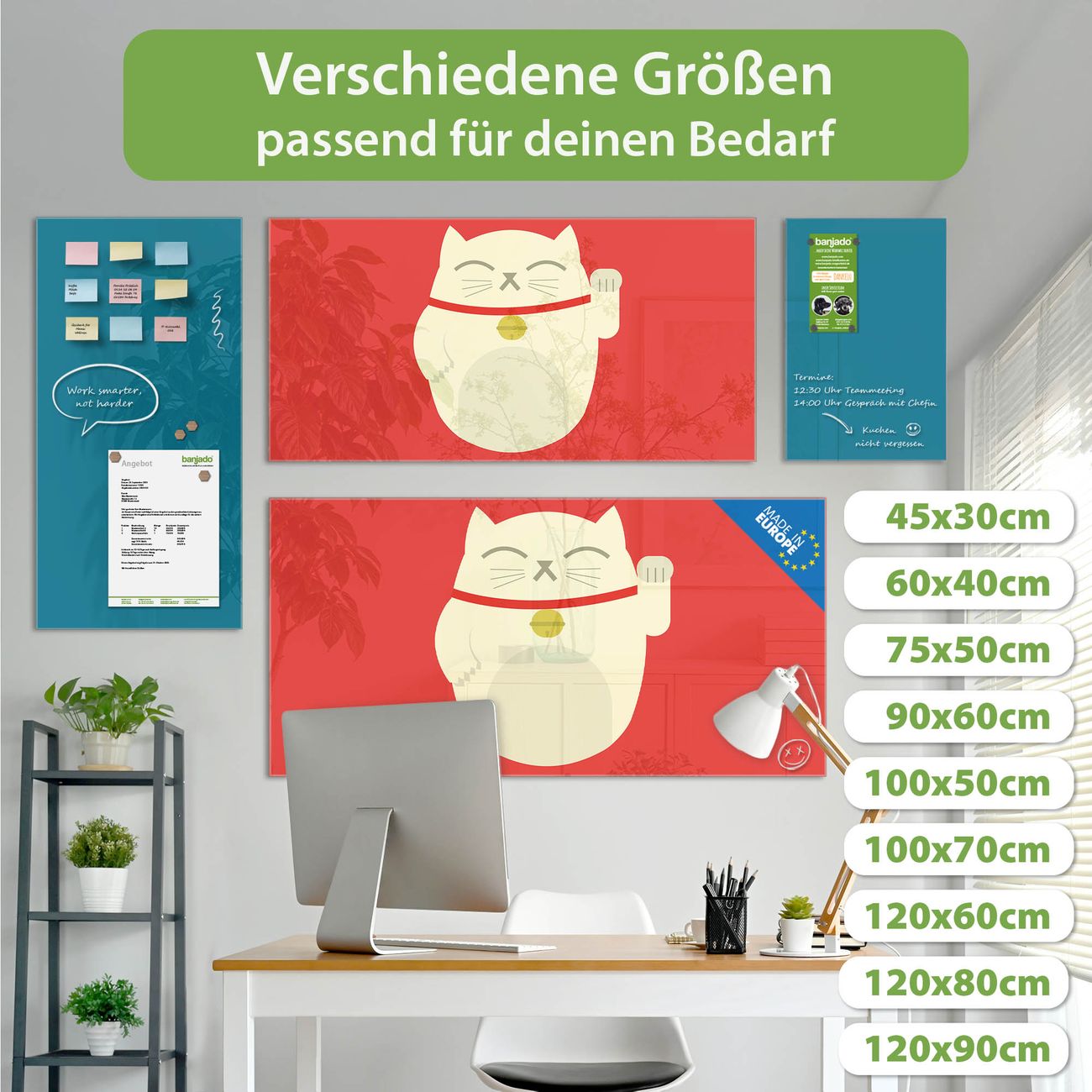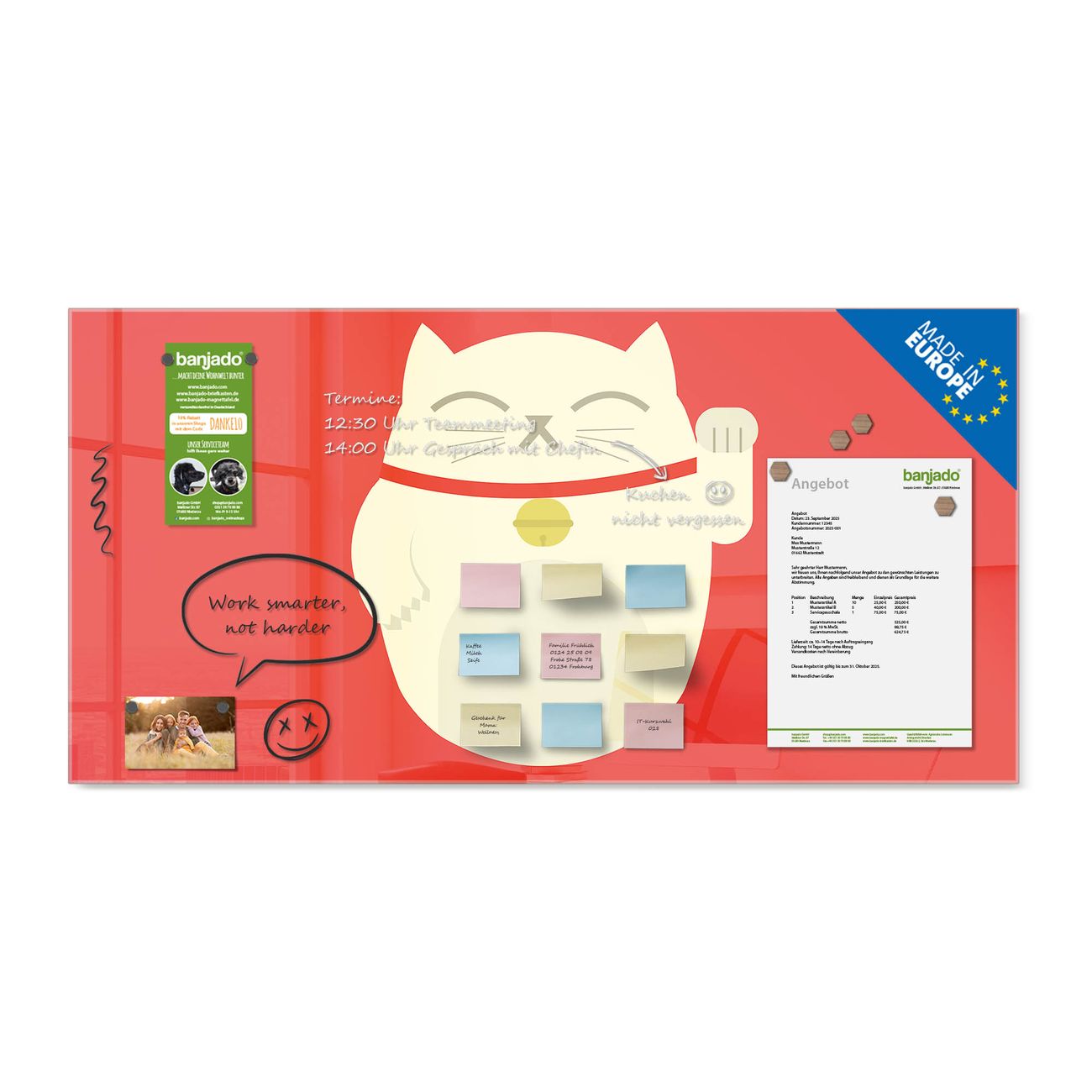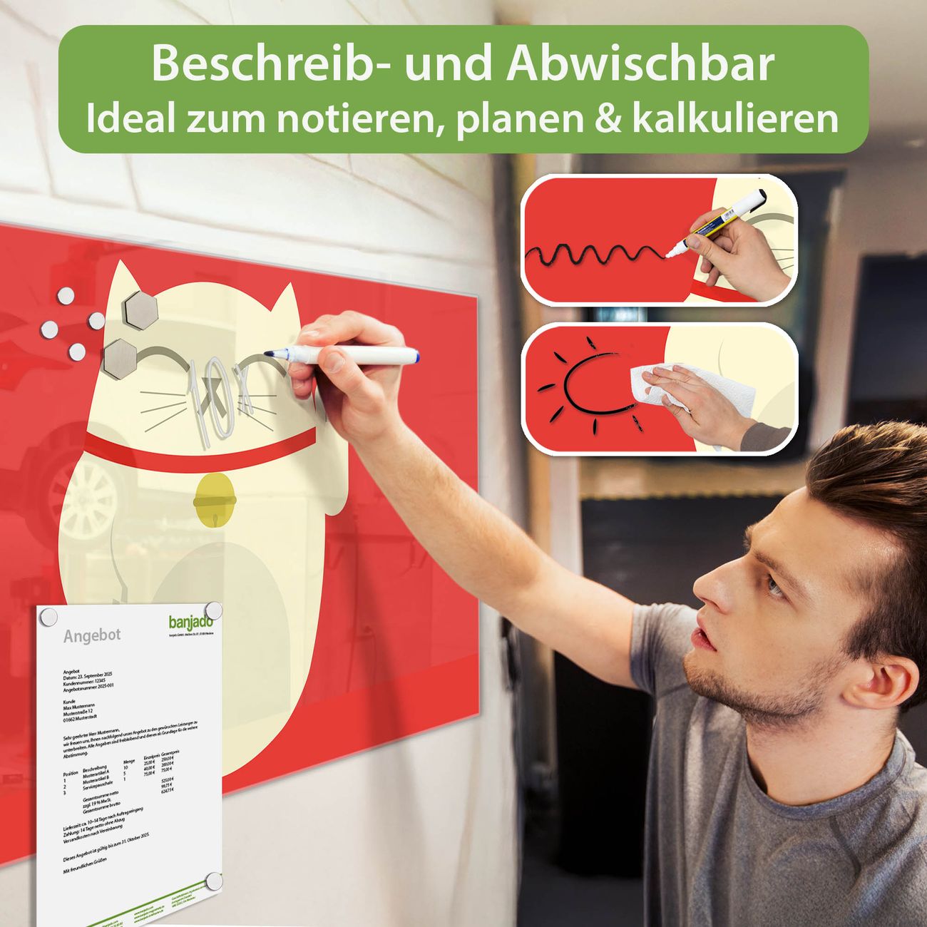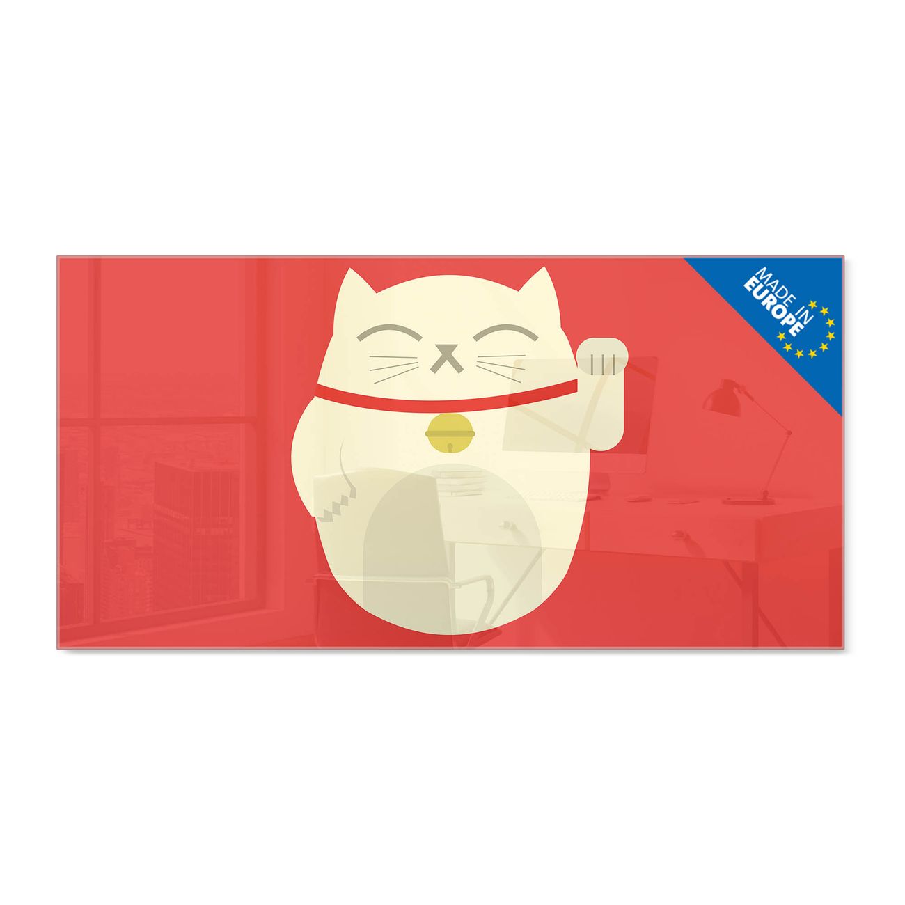 Material: 4mm Sicherheitsglas mit Metallrückwand Eigenschaften: beschreibbar, magnetisch, kratzfest Maße: 100x50x0,6cm, 7,50kg schwer Motiv Nummer 11799 Manekineko Zubehör: inklusive 4 Neodym-Magnete