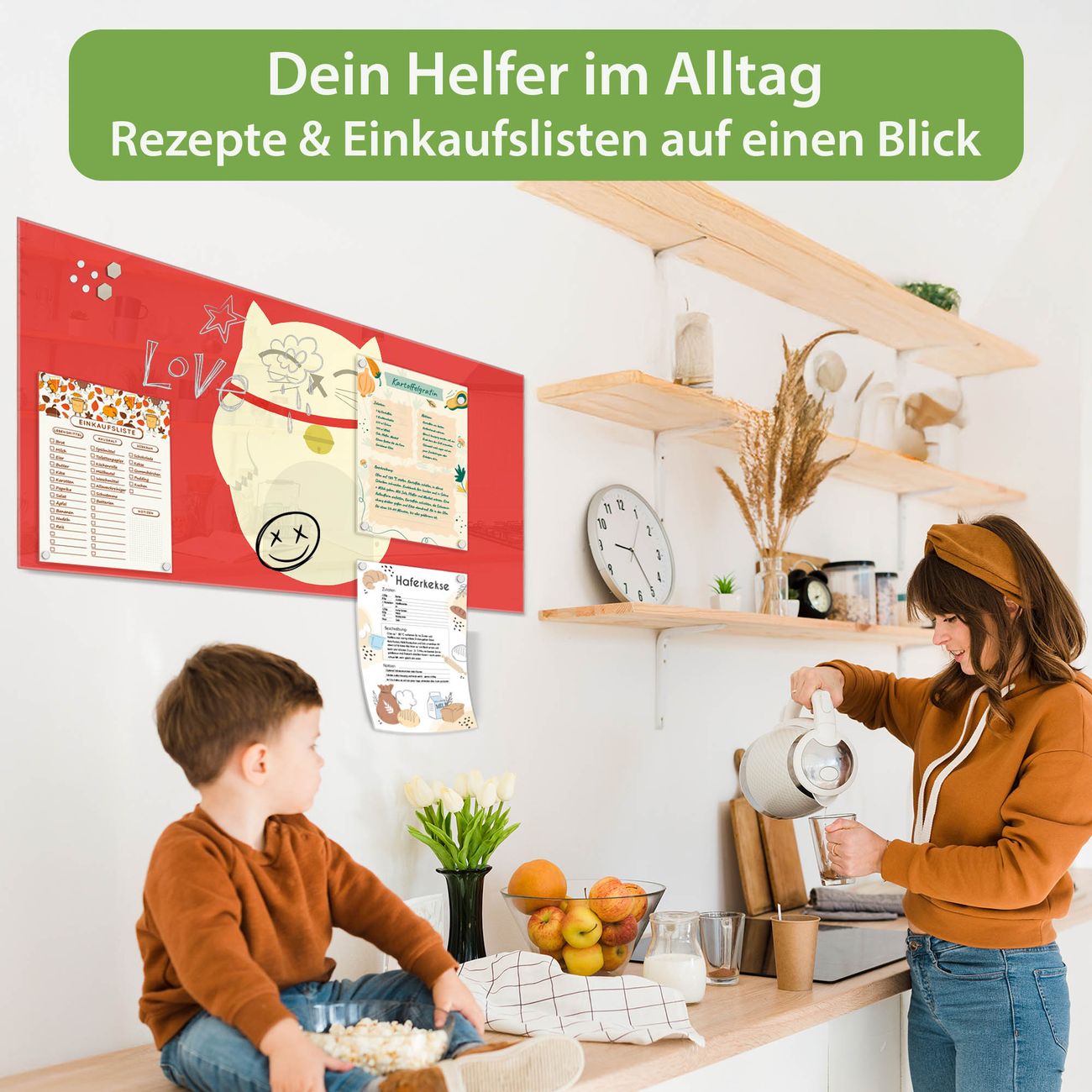 Auf der glatten Glasoberfläche lassen sich Termine, Rezepte oder Notizen ganz einfach mit Kreidestiften festhalten und rückstandslos entfernen. Starke Neodym-Magnete halten Ihre wichtigsten Erinnerungen sicher an Ort und Stelle. So entsteht Ihre ganz persönliche Ideenwand - jeden Tag neu.