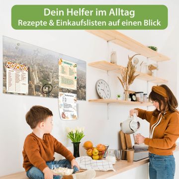 Material: 4mm Sicherheitsglas mit Metallrückwand Eigenschaften: beschreibbar, magnetisch, kratzfest Maße: 110x55x0,6cm, 9,08kg schwer Motiv Nummer 11769 Manhattan 1 Zubehör: inklusive 4 Neodym-Magnete