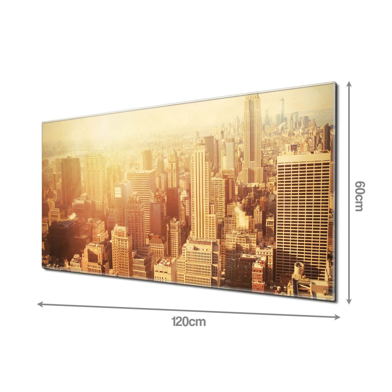 Material: 4mm Sicherheitsglas mit Metallrückwand Eigenschaften: beschreibbar, magnetisch, kratzfest Maße: 120x60x0,6cm, 10,80kg schwer Motiv Nummer 12417 Manhattan 2 Zubehör: inklusive 4 Neodym-Magnete