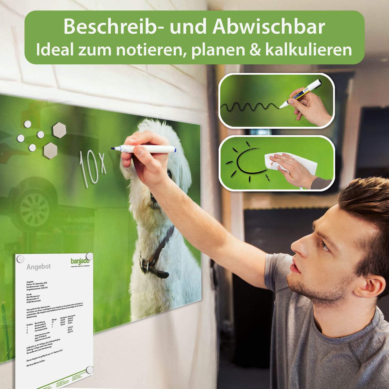 Material: 4mm Sicherheitsglas mit Metallrückwand Eigenschaften: beschreibbar, magnetisch, kratzfest Maße: 100x50x0,6cm, 7,50kg schwer Motiv Nummer 12379 Mareike Zubehör: inklusive 4 Neodym-Magnete
