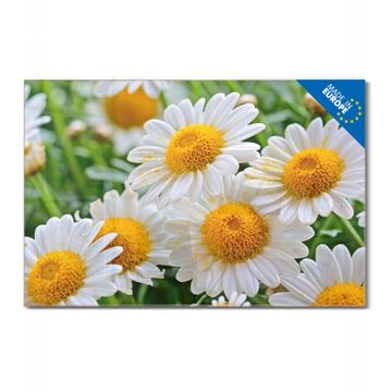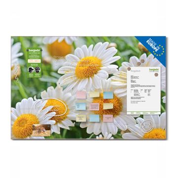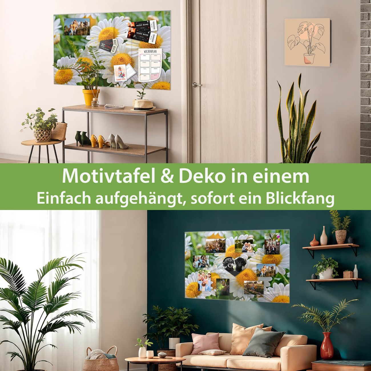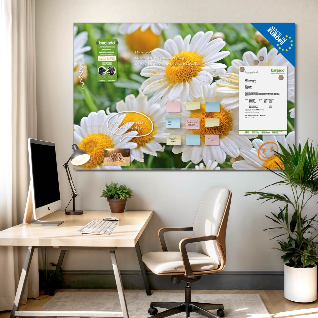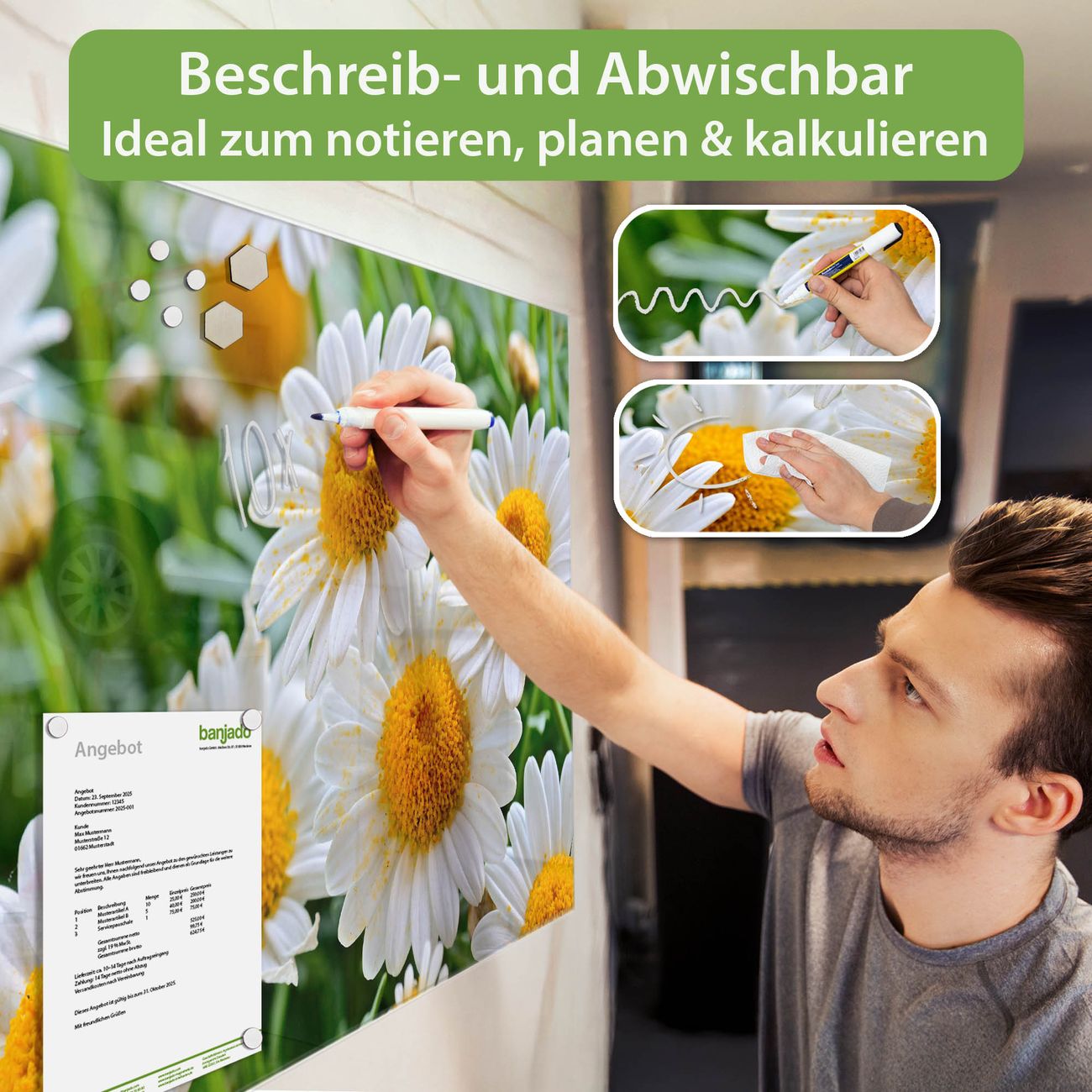 Material: 4mm Sicherheitsglas mit Metallrückwand Eigenschaften: beschreibbar, magnetisch, kratzfest Maße: 120x80x0,6cm, 14,40kg schwer Motiv Nummer 12334 Margeriten Illustration Zubehör: inklusive 4 Neodym-Magnete