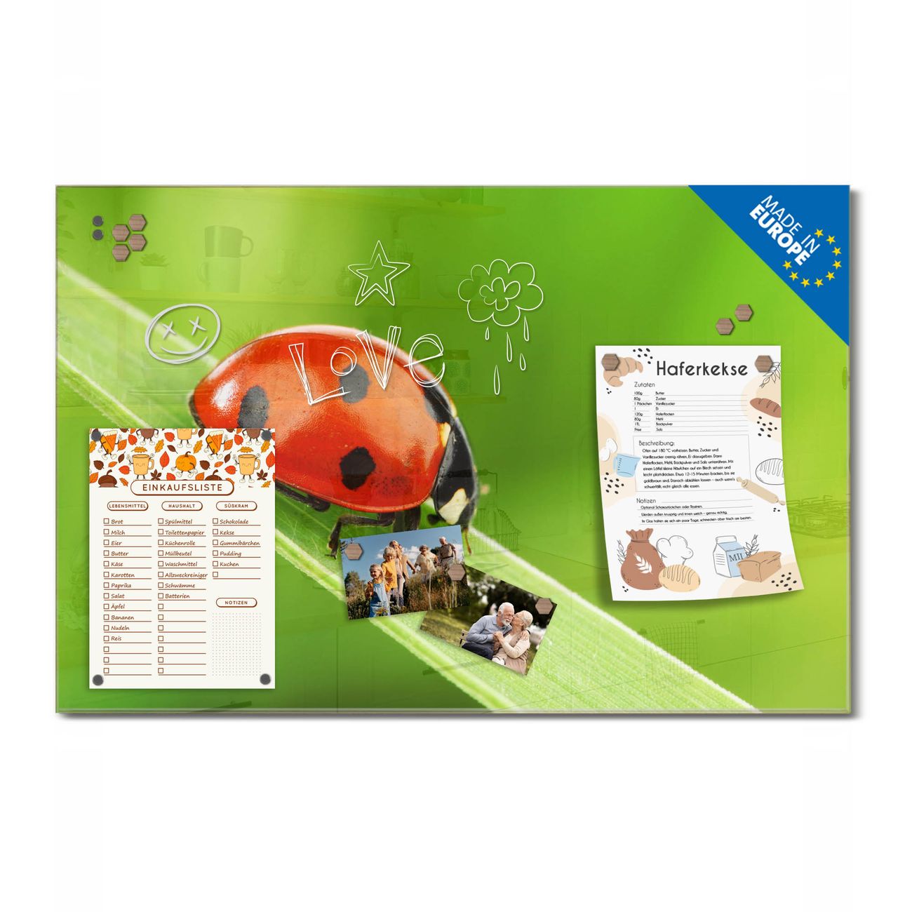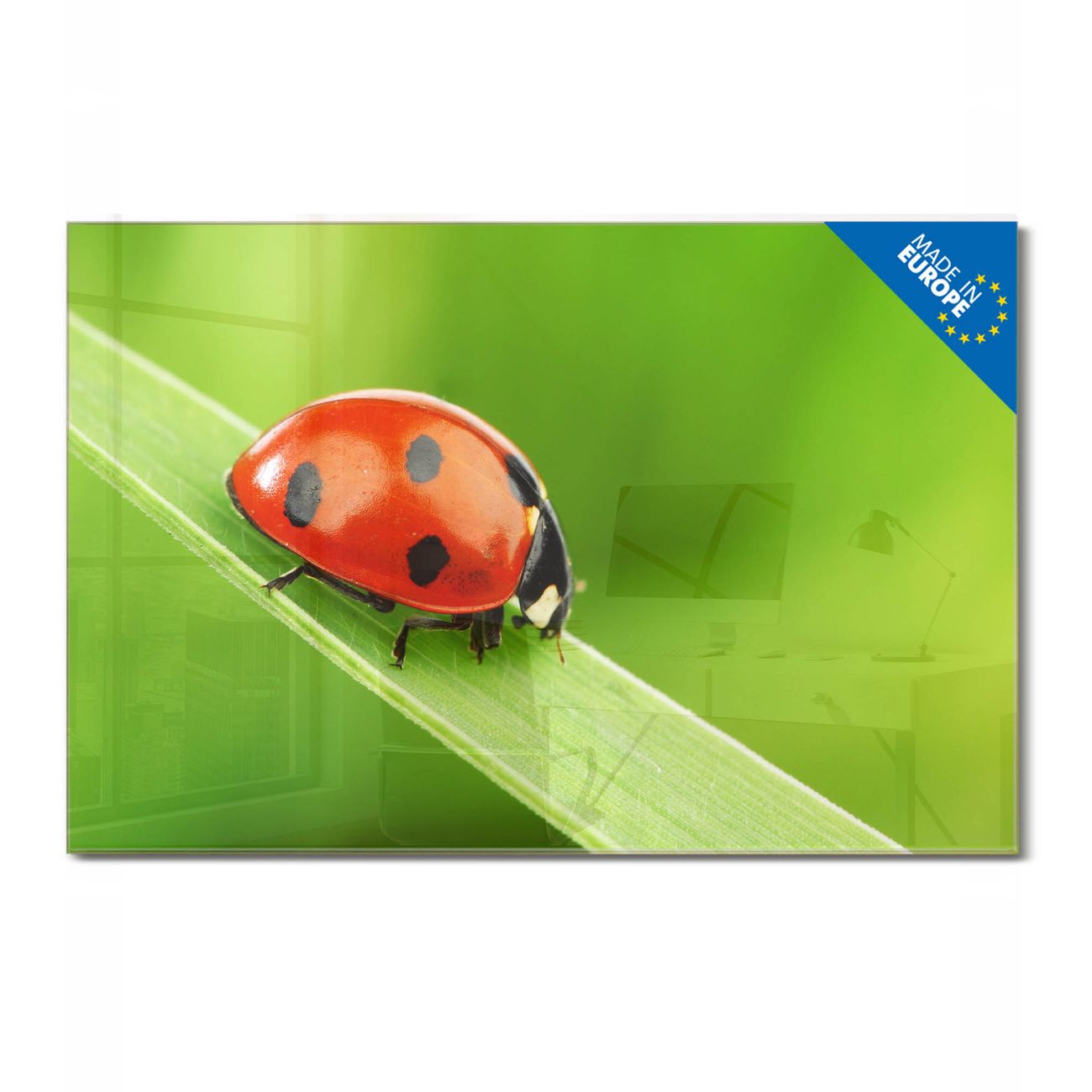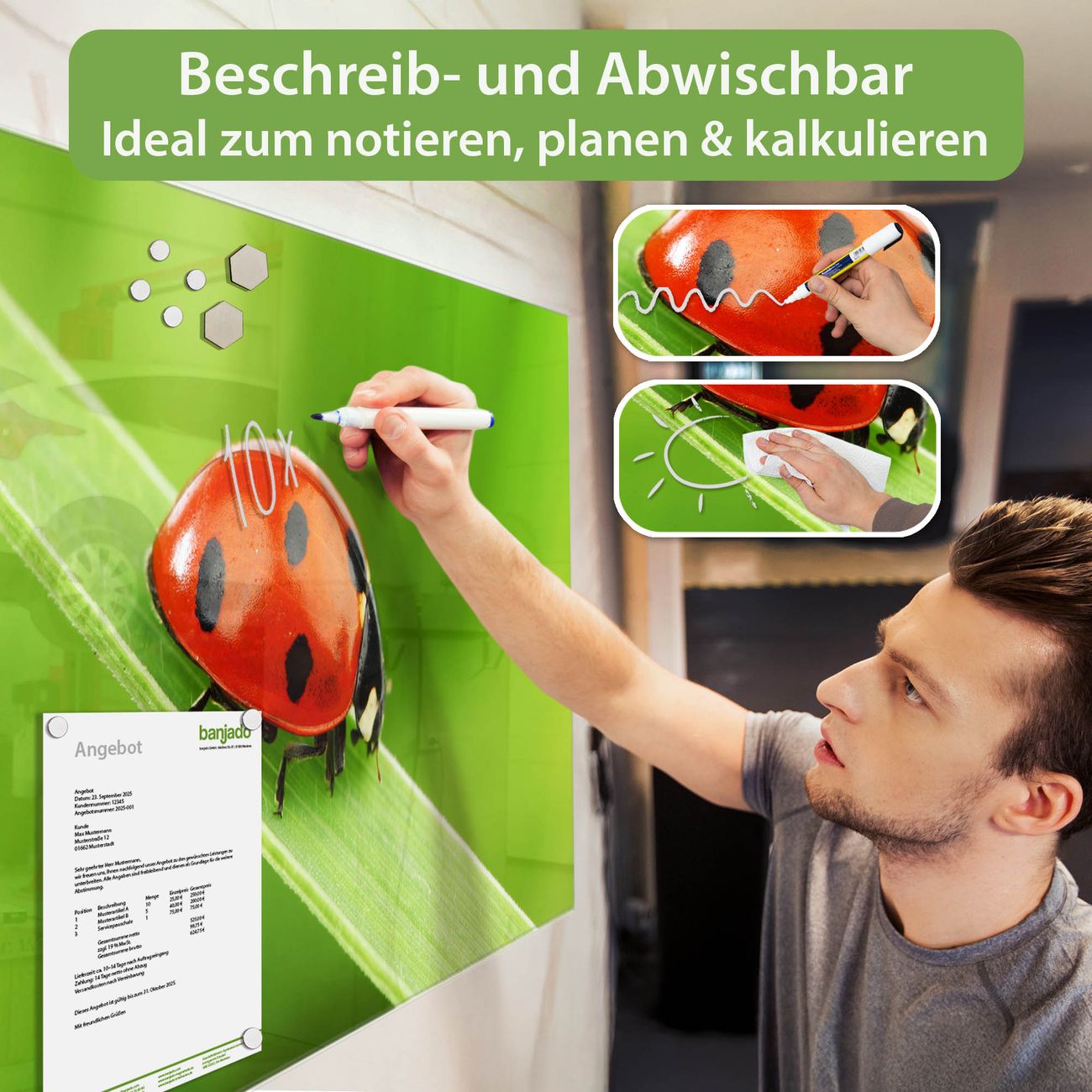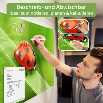 Material: 4mm Sicherheitsglas mit Metallrückwand Eigenschaften: beschreibbar, magnetisch, kratzfest Maße: 75x50x0,6cm, 5,63kg schwer Motiv Nummer 10047 Marienkäfer Zubehör: inklusive 4 Neodym-Magnete