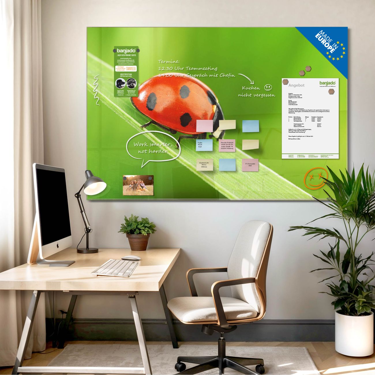 Jede Glas Magnettafel wird in unserer Werkstatt von Hand gefertigt und sorgfältig geprüft. So erhalten Sie ein echtes Qualitätsprodukt, das Funktion und Ästhetik perfekt vereint.?? Warum banjado?
