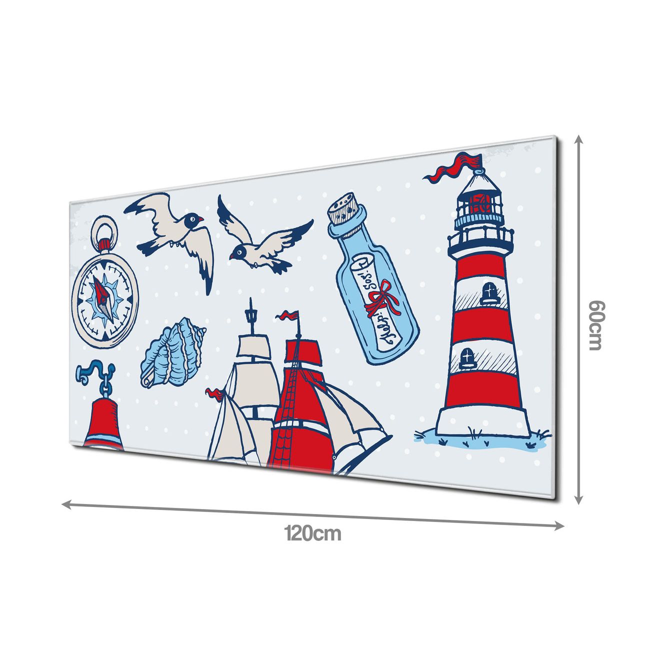 Material: 4mm Sicherheitsglas mit Metallrückwand Eigenschaften: beschreibbar, magnetisch, kratzfest Maße: 120x60x0,6cm, 10,80kg schwer Motiv Nummer 10483 Schiff Ahoj Zubehör: inklusive 4 Neodym-Magnete