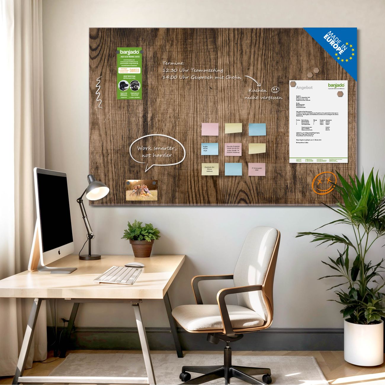 Die banjado Glas Magnettafel mit dem Motiv Motiv Maserung Dunkel verbindet Funktionalität mit Stil. Sie ersetzt das Zettelchaos durch klare Strukturen und bringt dabei eine warme, natürliche Atmosphäre in Ihr Zuhause. Ob im Büro, in der Küche oder im Eingangsbereich - dieses Design-Board zieht Blicke an und sorgt für Ordnung mit Charakter.