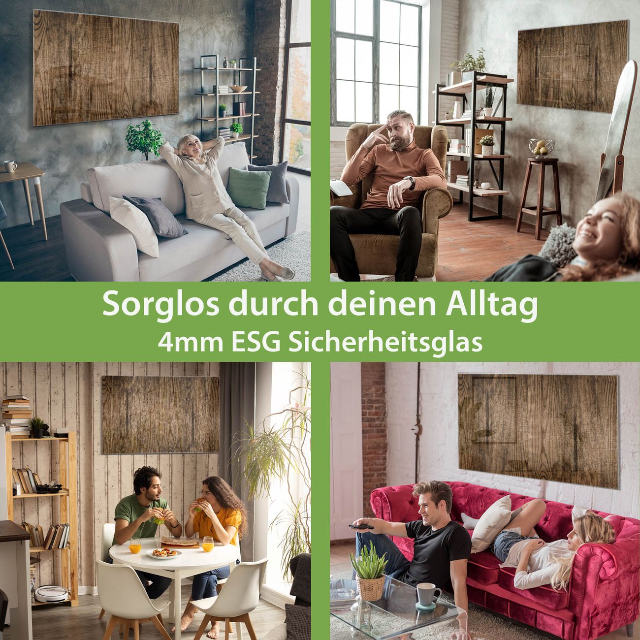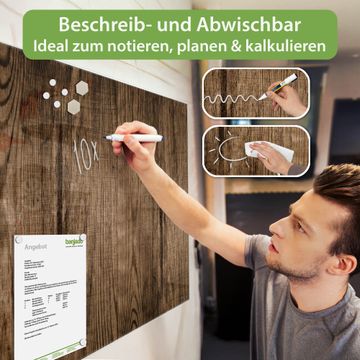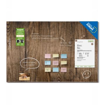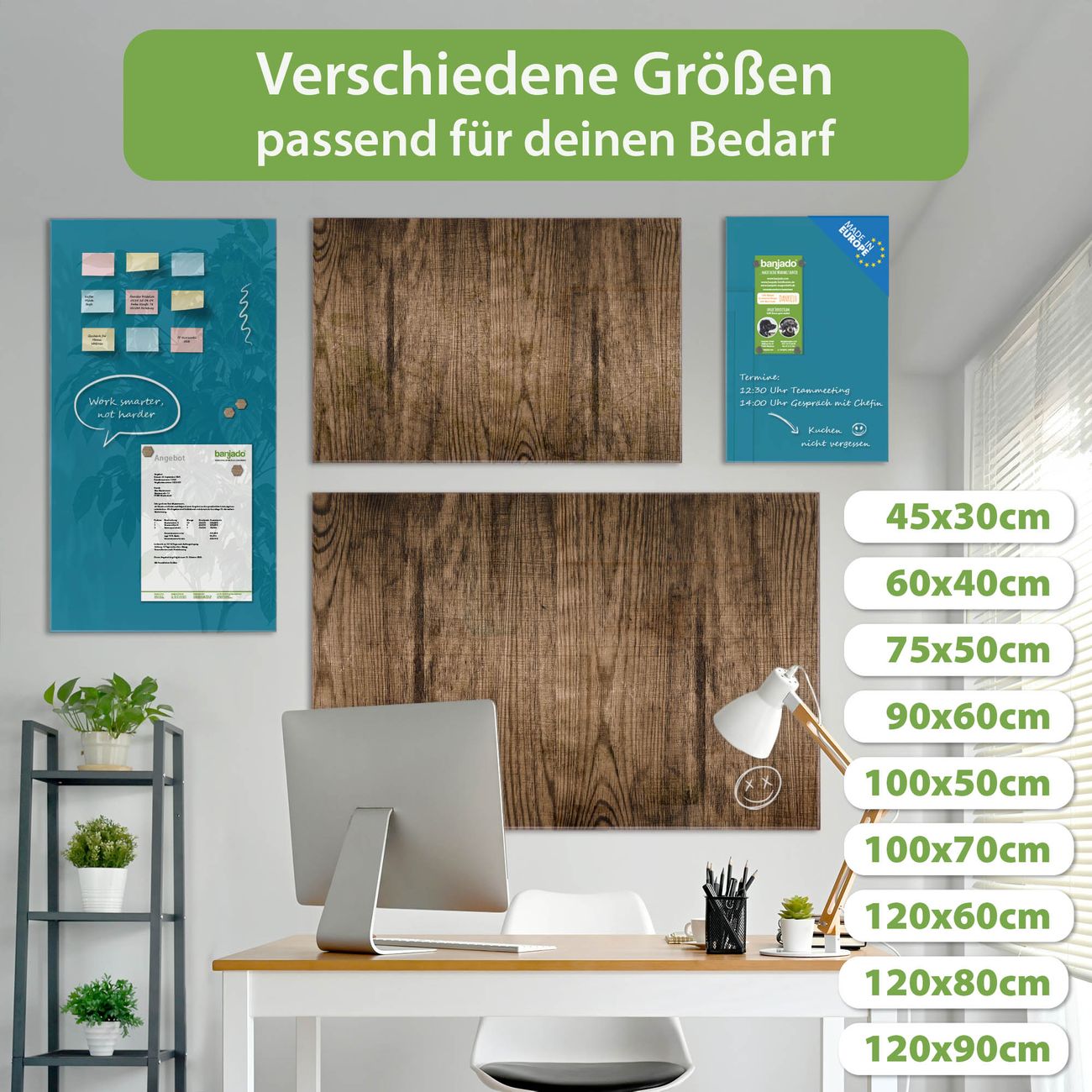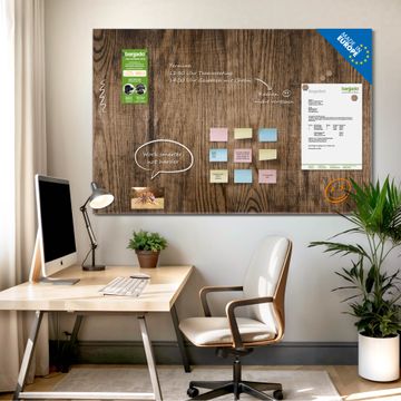 Material: 4mm Sicherheitsglas mit Metallrückwand Eigenschaften: beschreibbar, magnetisch, kratzfest Maße: 120x80x0,6cm, 14,40kg schwer Motiv Nummer 11317 Maserung Dunkel Zubehör: inklusive 4 Neodym-Magnete